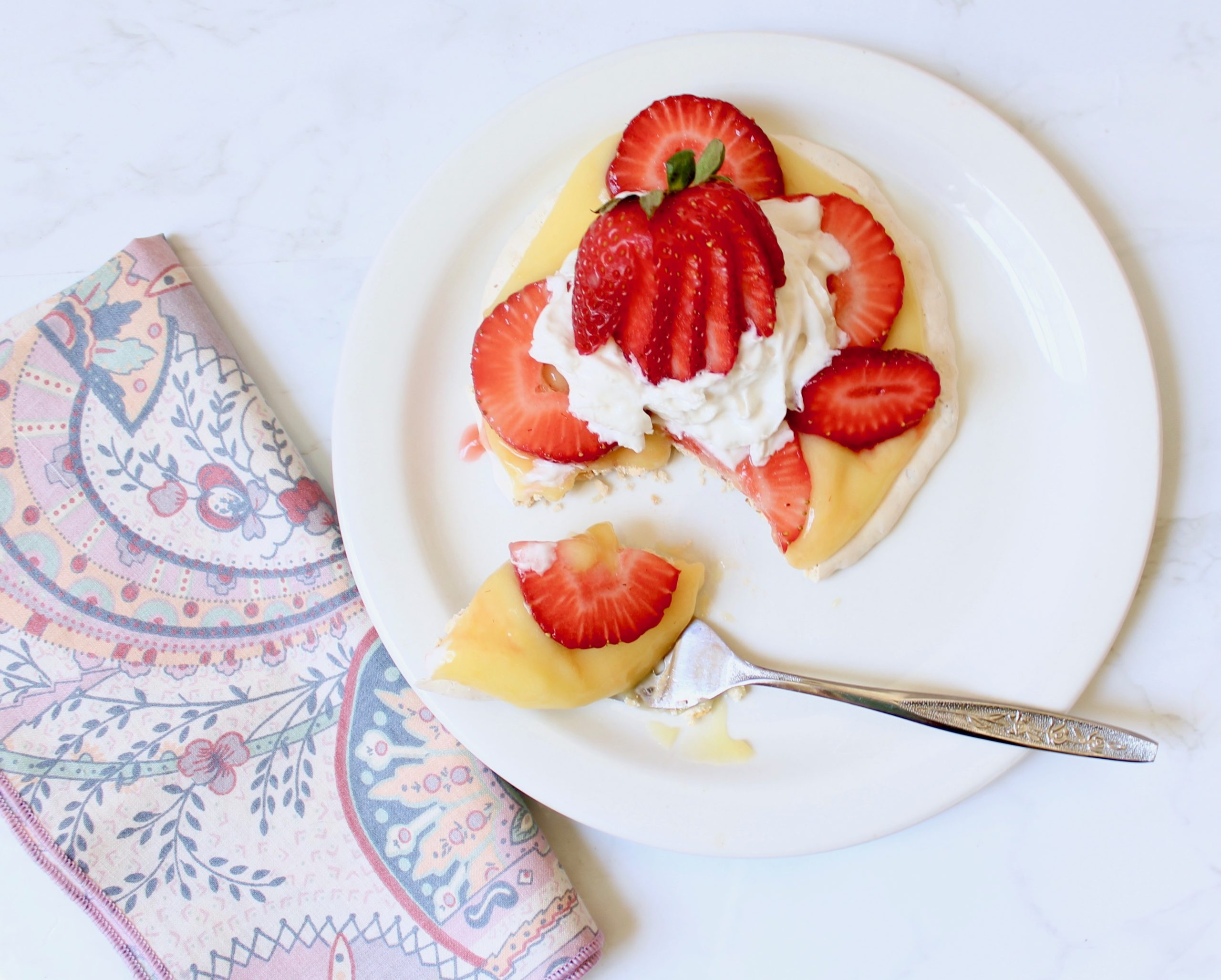 Some of the components may be made ahead for assembly later. The meringues will last very tightly covered (warm weather humidity is their enemy) for several days, as will the lemon curd in the fridge. The berries, tossed with a little red wine vinegar for zing and tartness to cut the sweet, must be prepped right before serving. The almond milk whipped cream must be shaken very well.