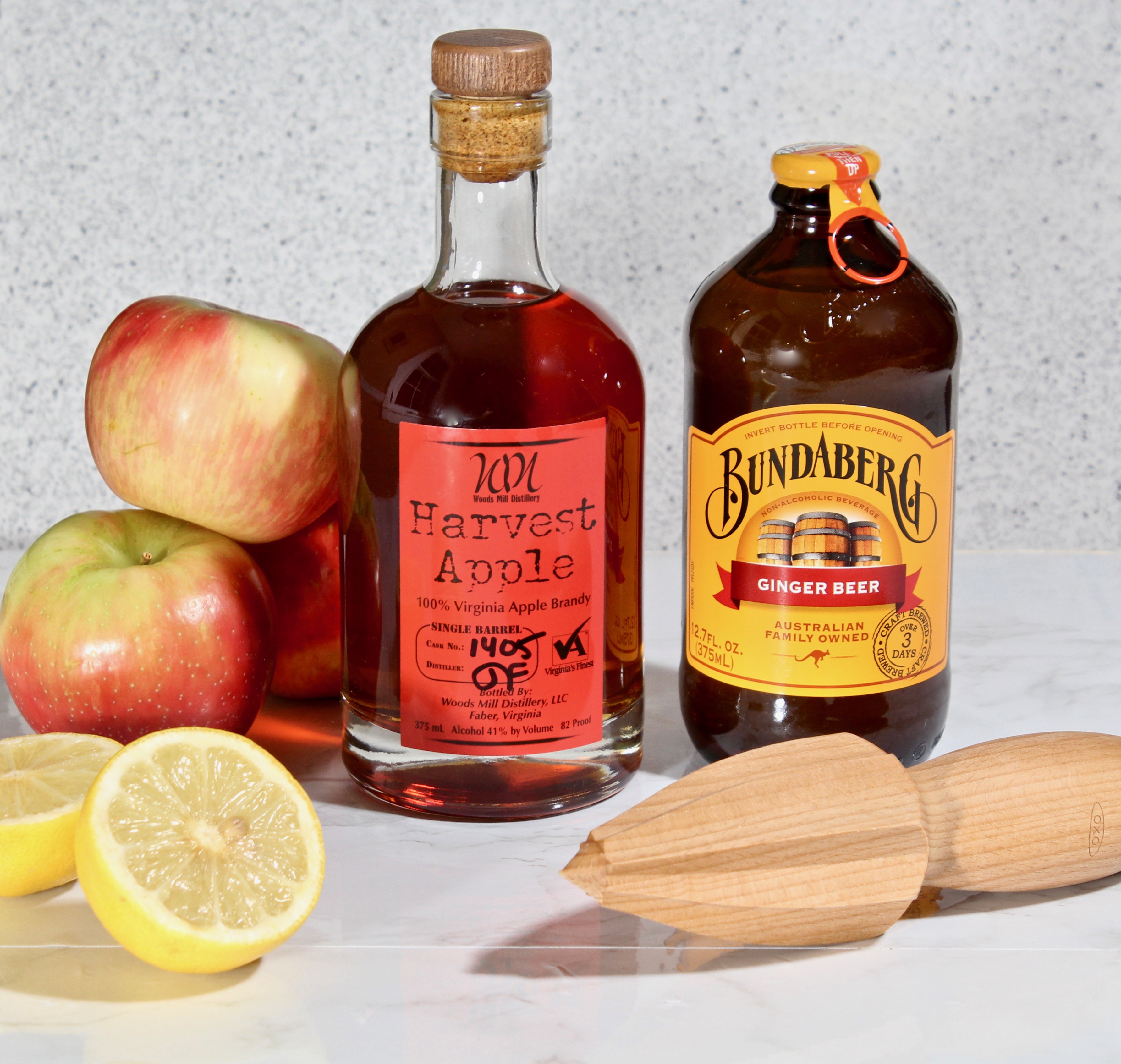 My friend the talented amateur mixologist made a delightfully refreshing mule a few weeks back. That predinner drink was the inspiration for my seasonal cocktail. I suppose you could place this beverage in the mule category : alcohol, ginger beer and citrus. But, oh, that apple brandy with its dark amber sweet heat—not as sharp as vodka and a perfect partner for the lightly sweet ginger beer. Not your average mule.