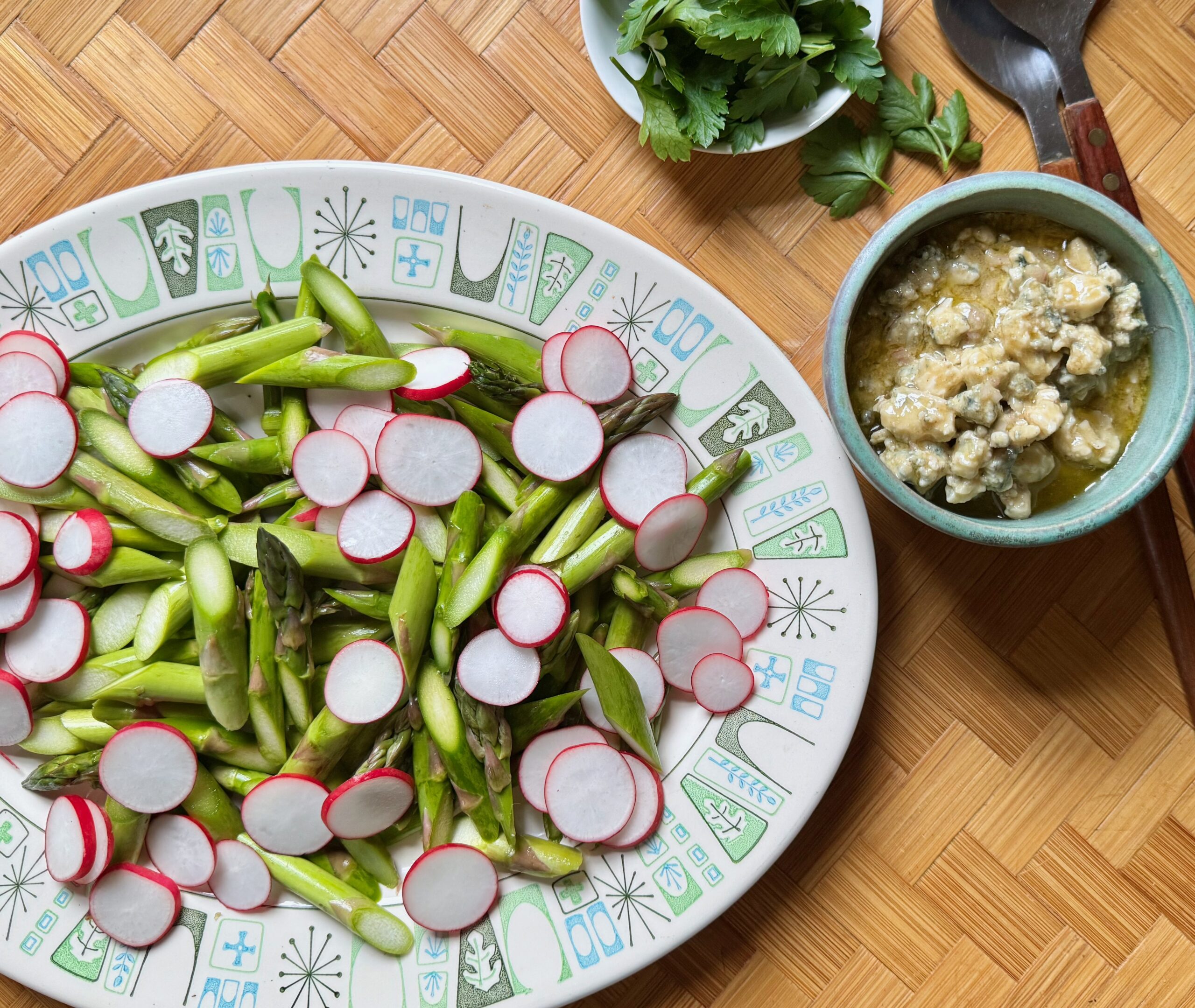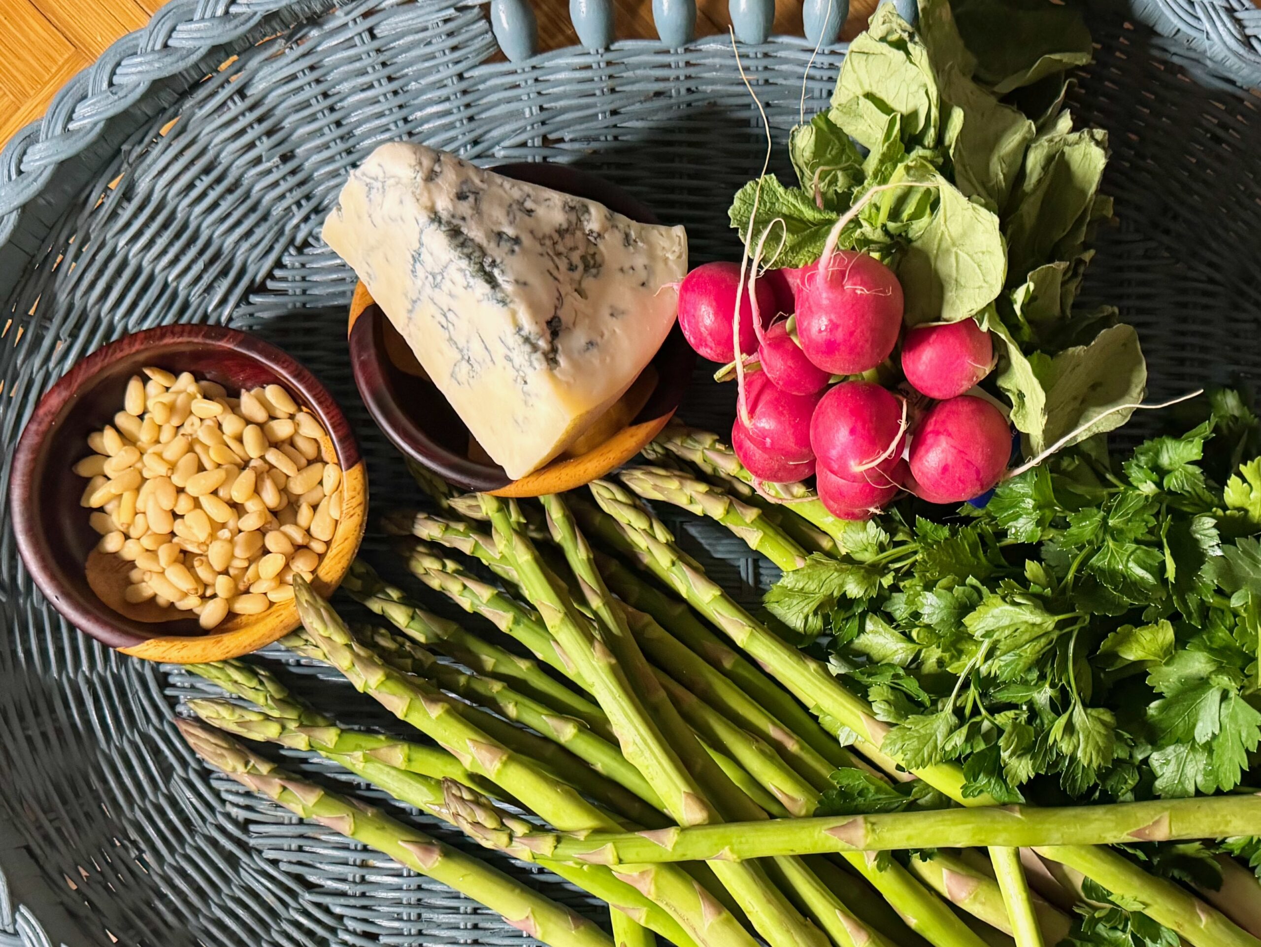 The subtle flavor of asparagus pairs well with strong flavored cheese, like parmesan, feta or blue veined cheeses. My favorite blues are Point Reyes and Buttermilk Blue. Use your favorite and feel free to substitute if blue veined cheeses are not your thing.