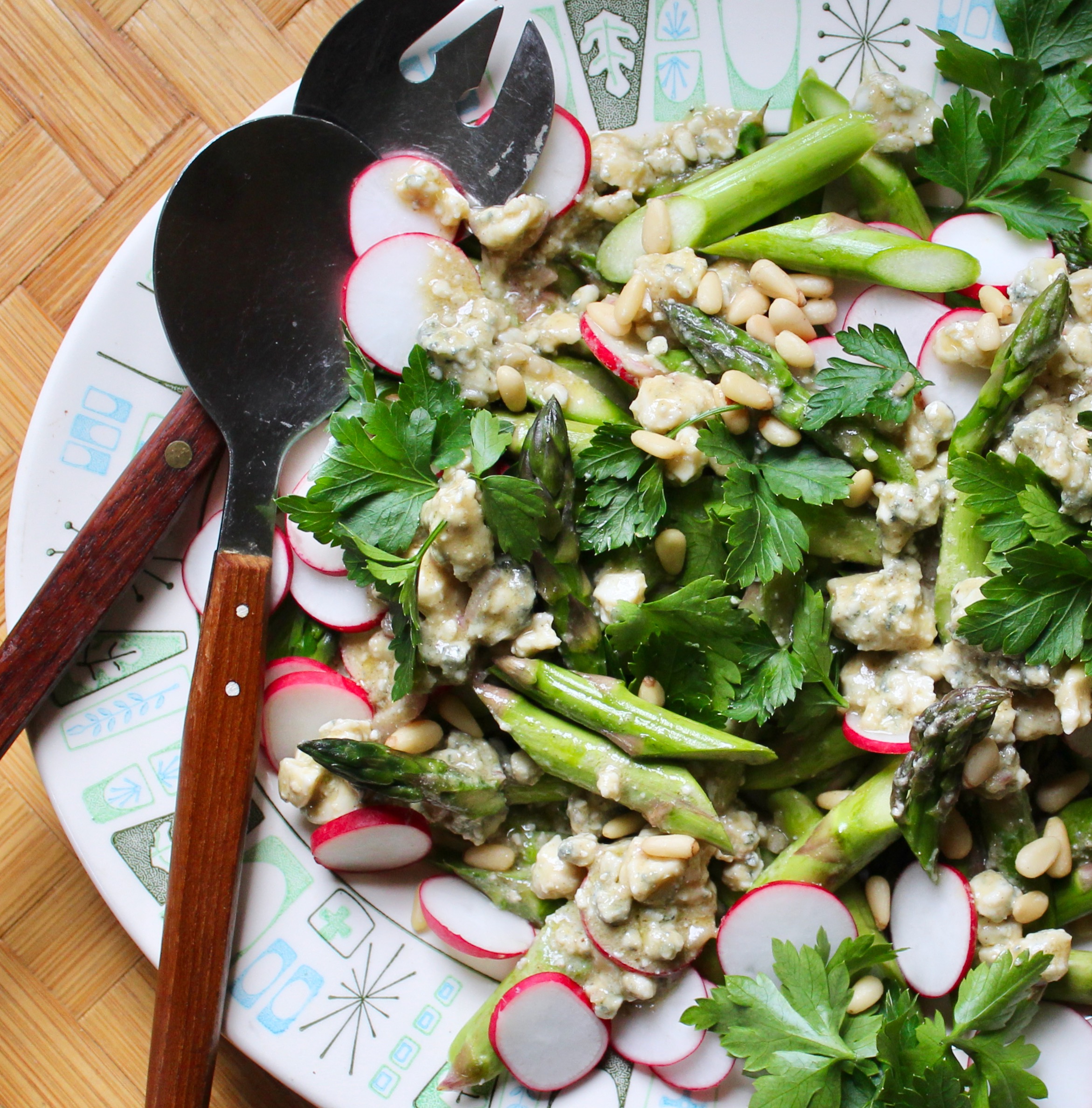 Now I know why winter asparagus is so woody! Lovely way to use the tender stalks of spring. Looking forward to shaking up my salad routine with this beauty, love the pairing with tangy blue cheese…