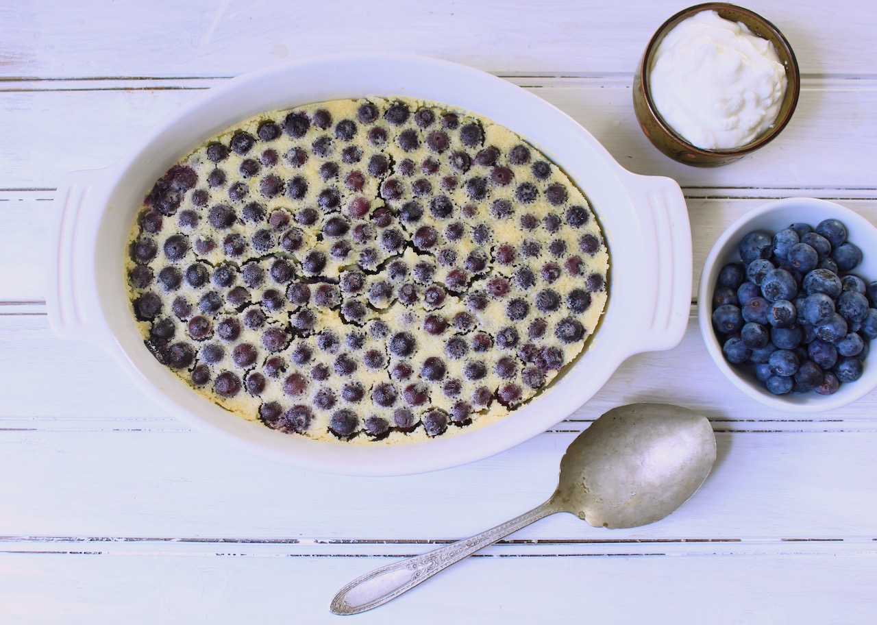 Blueberries and lemon make amiable partners. A light lemon glaze atop a moist cheesecake filled blueberry bundt cake? Yes, please. One major difference between today’s recipe and that of clafoutis is the admonition to enjoy the clafoutis warm from the oven. Never a fan of warm cake or pie, I opt for chilling this sweet treat for maximum pleasure. However, your desires should dictate the serving.