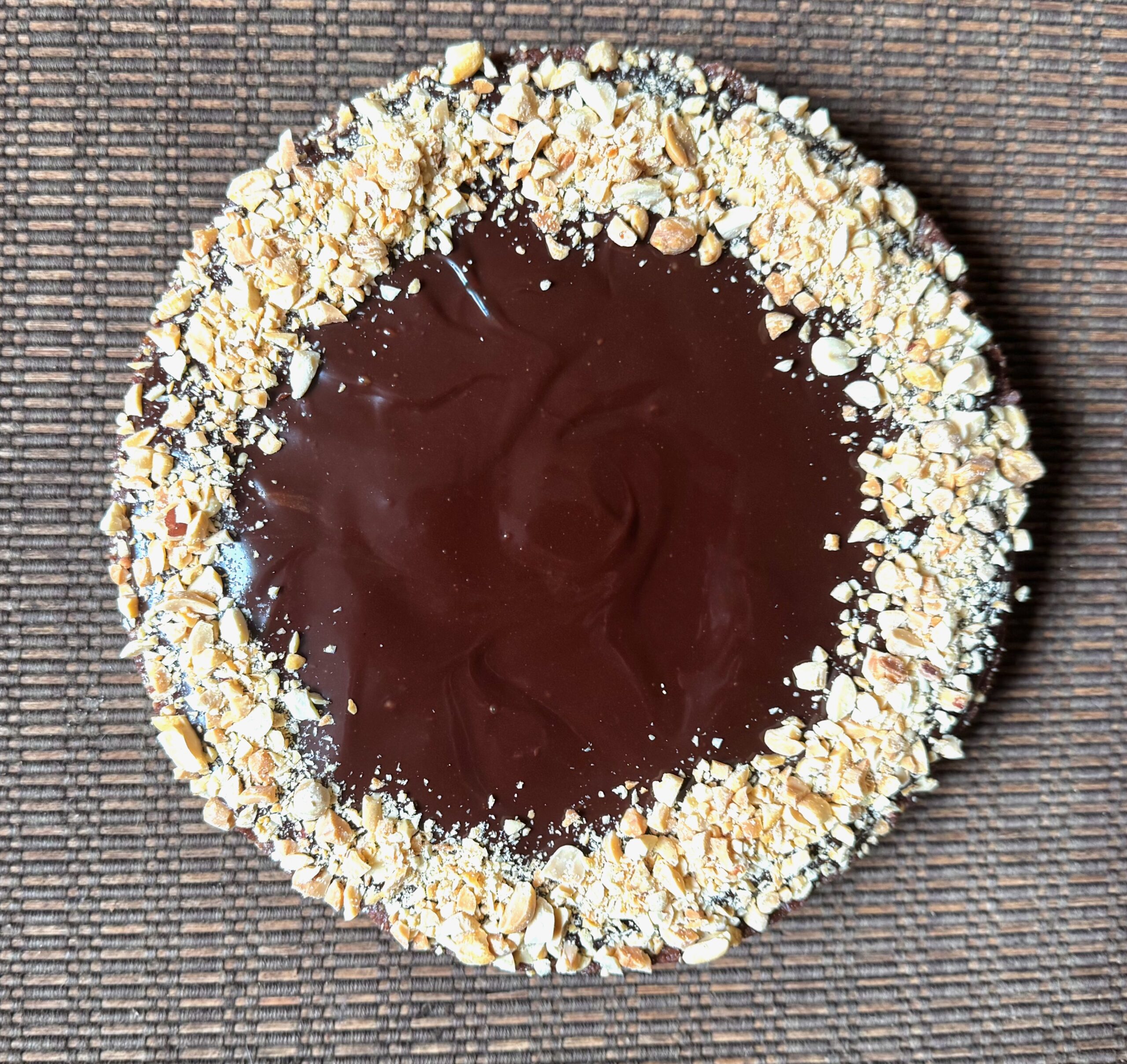 - With a small spatula, spread the chocolate ganache over the tart, to the edges.