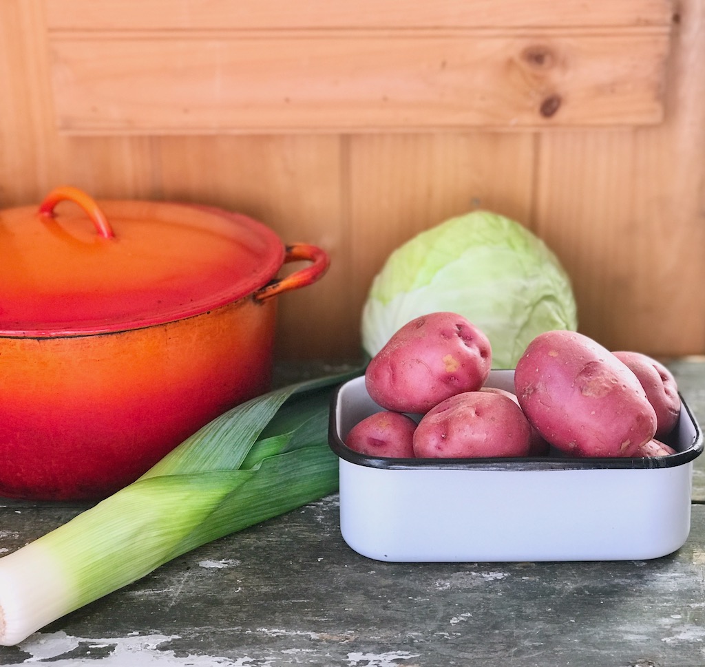 I like skin-on red potatoes for flavor, fiber and color. Leeks instead of green onion add depth of flavor and a little chew. Cabbage, when melted with leeks and butter, is tender and sweet. Half a brick of neufchâtel cheese adds creaminess that stands up to freezing for later.