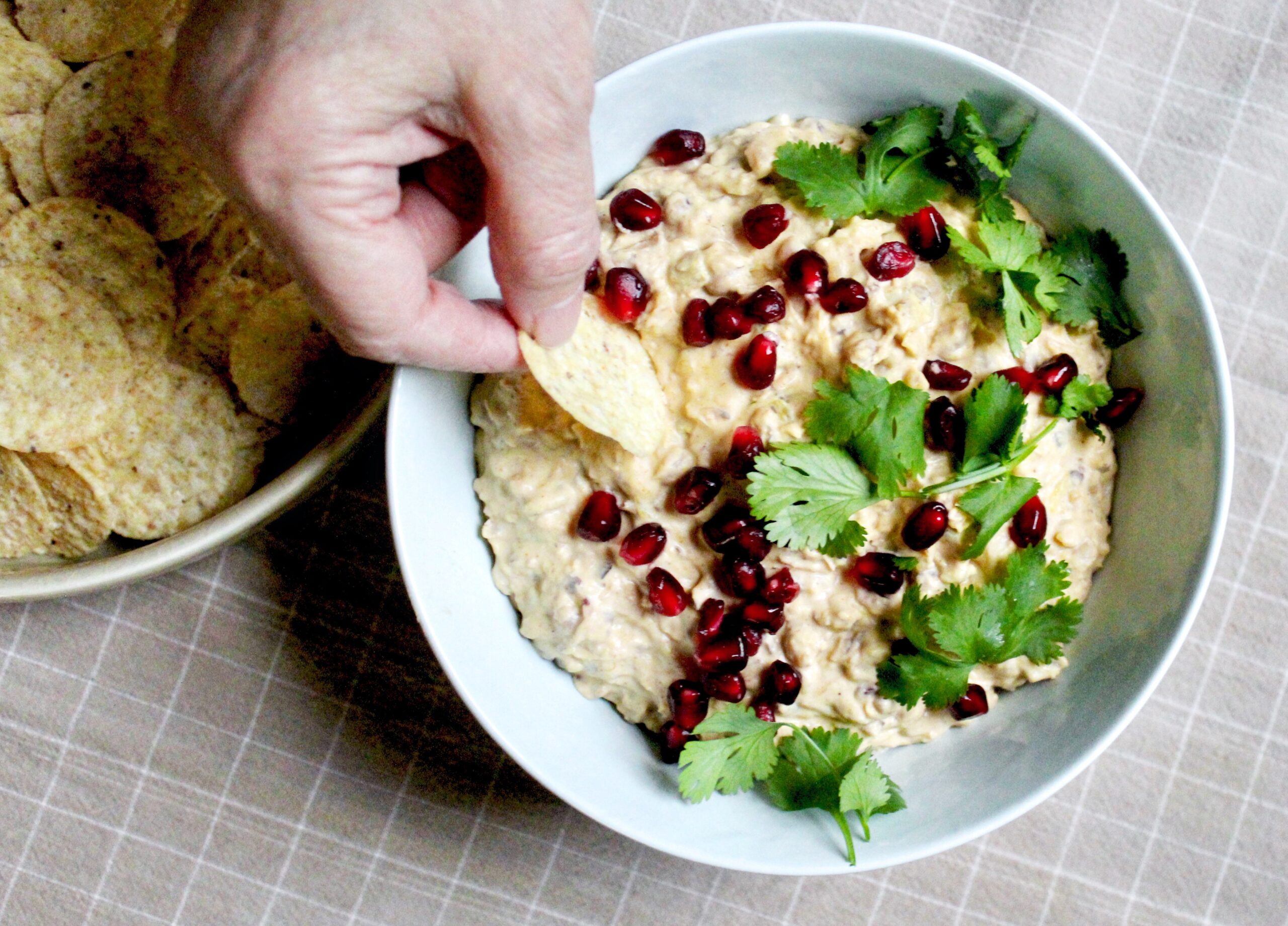 Garnishes of cilantro leaves and pomegranate seeds brighten the mellow palette of this appetizer. Feel free to improvise with more or less spicy heat.