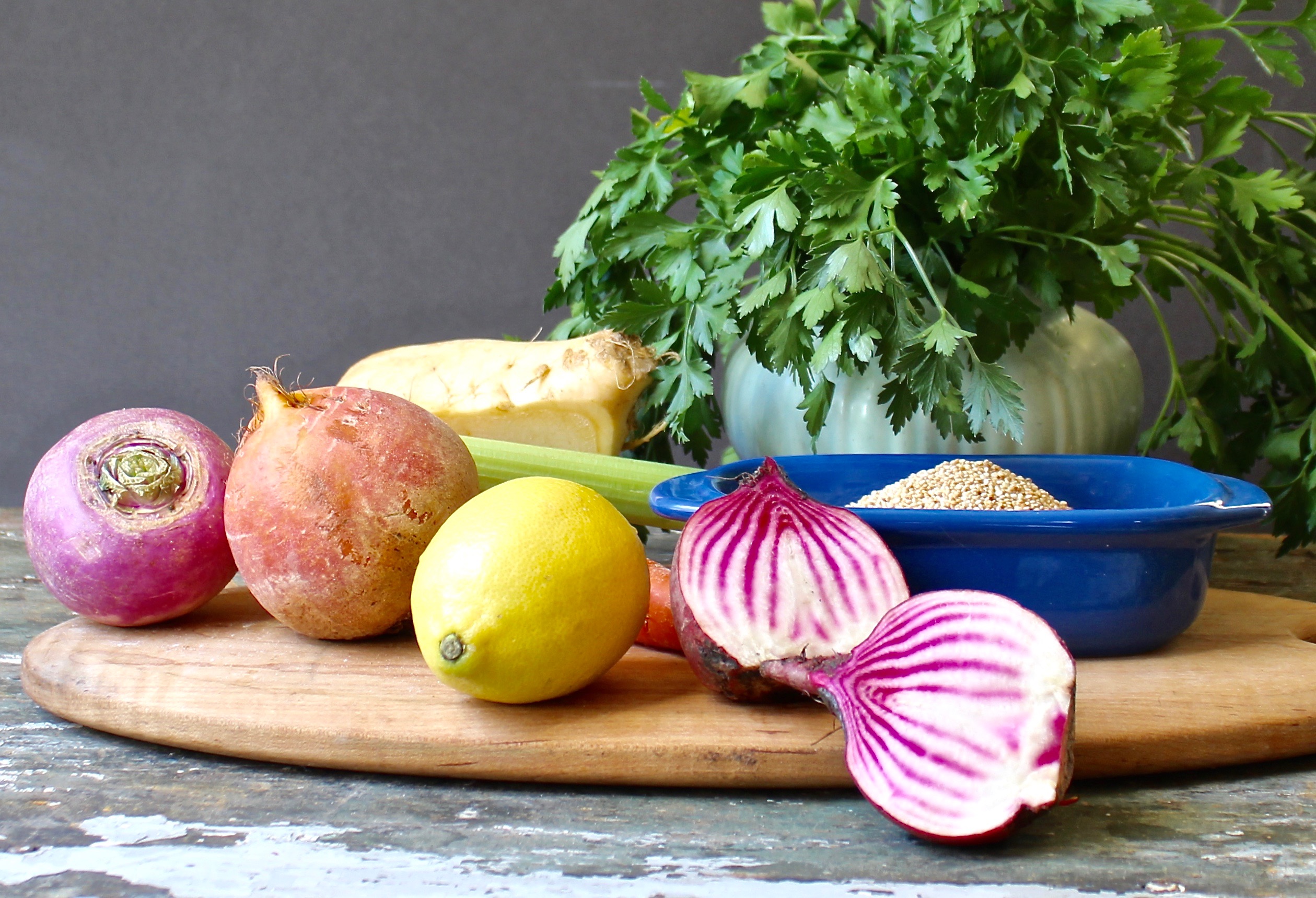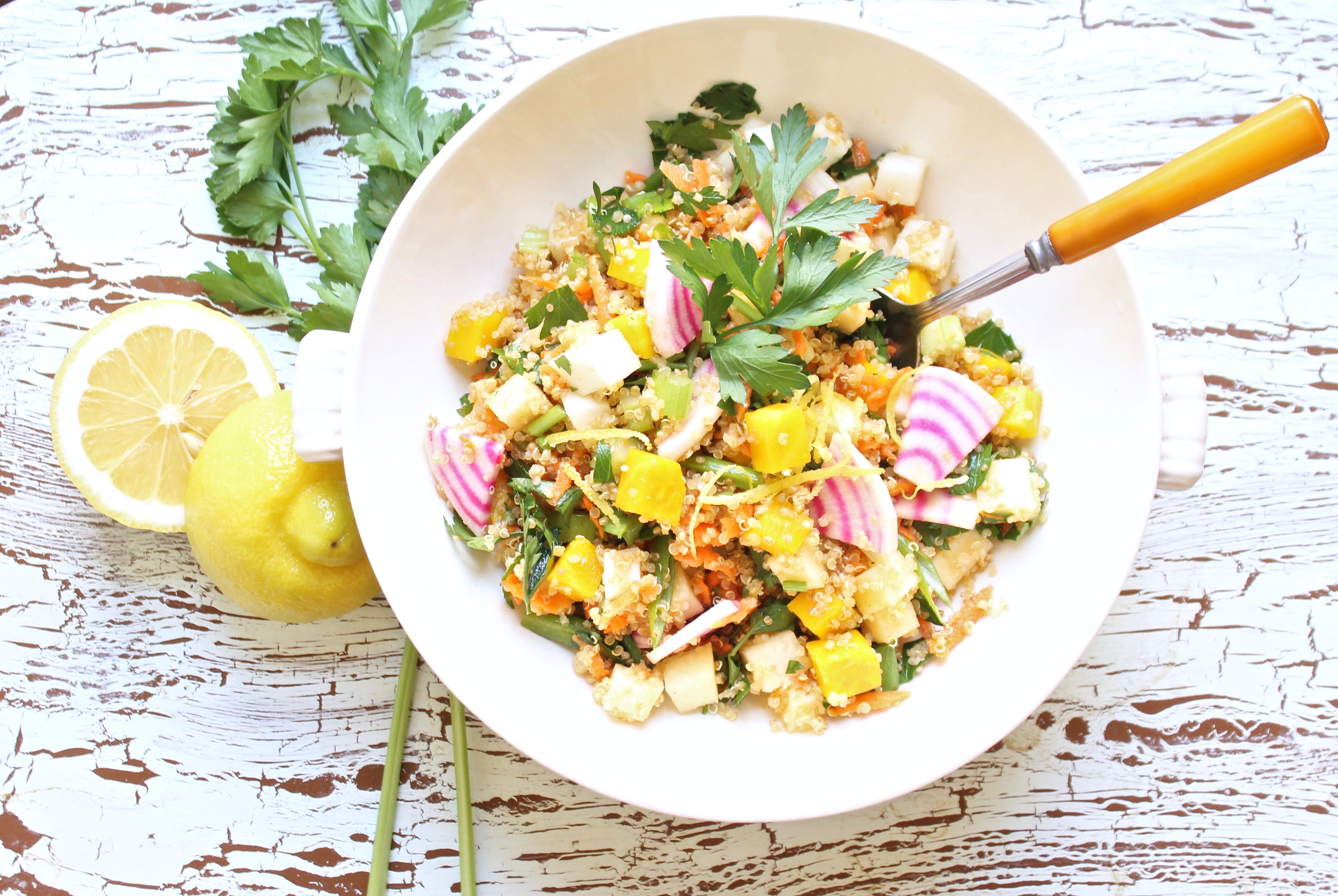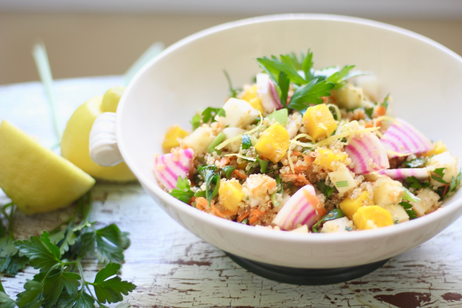 Think of this crunchy quinoa vegetable salad as a type of wheat-less tabbouleh, with one entire bunch of grassy Italian parsley, scallion and fresh lemon juice. Round out the mix with a plethora of crunchy root vegetables and you’ve got a meal that satisfies because you must chew thoughtfully with all those nice veggies and because you will feel energized and not at all drowsy after enjoying this lunch.