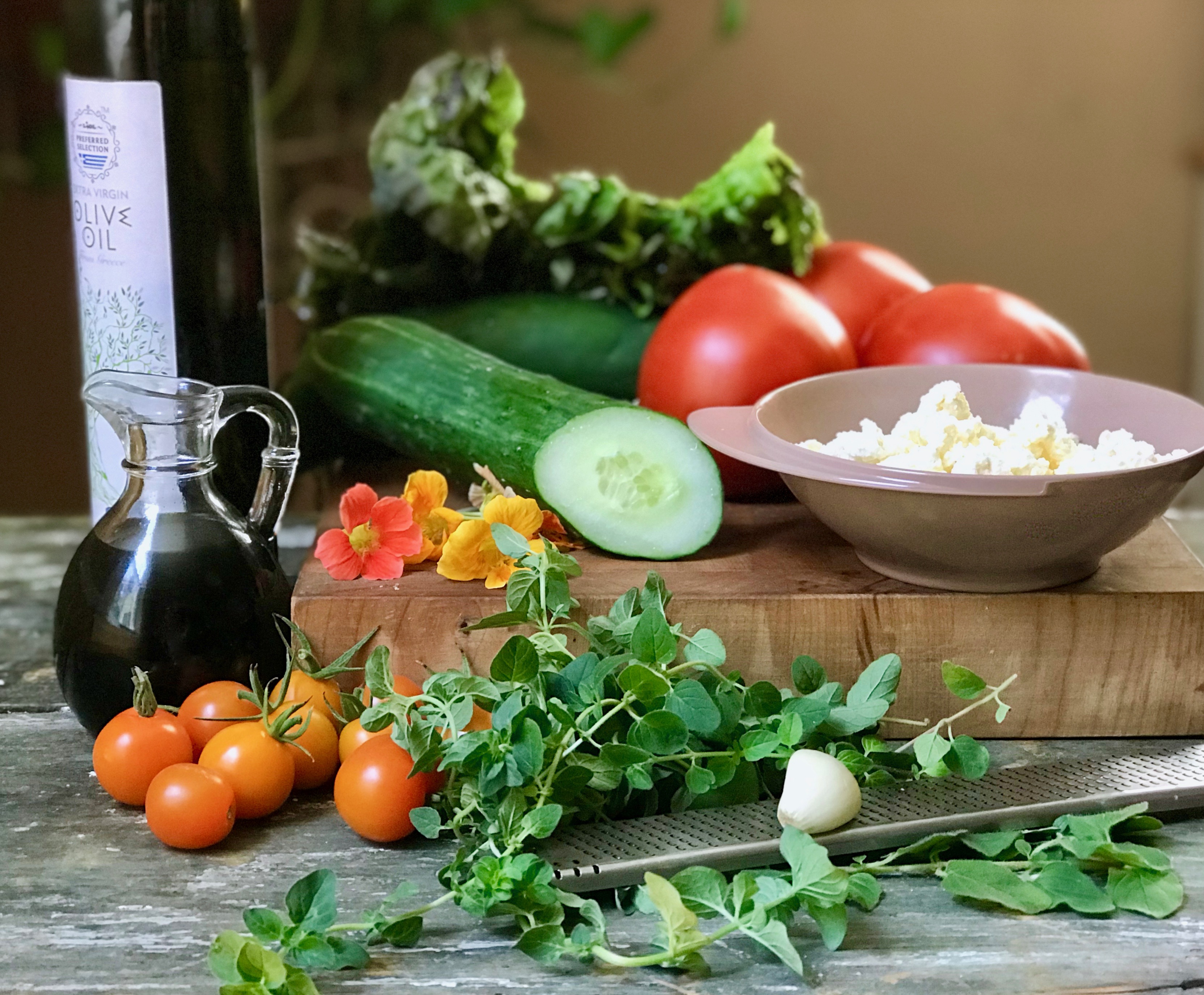 Cooking for a client one afternoon I noticed a bottle of commercial dressing in the fridge with bits of feta, slick with olive oil and murky with tangy balsamic vinegar. Why didn’t I think of this? It looked intriguing and it tasted pretty good. The oregano in my deck pots needed a good trim, there is plenty of tasty organic balsamic vinegar and extra virgin olive oil in the pantry and feta cheese is a given.