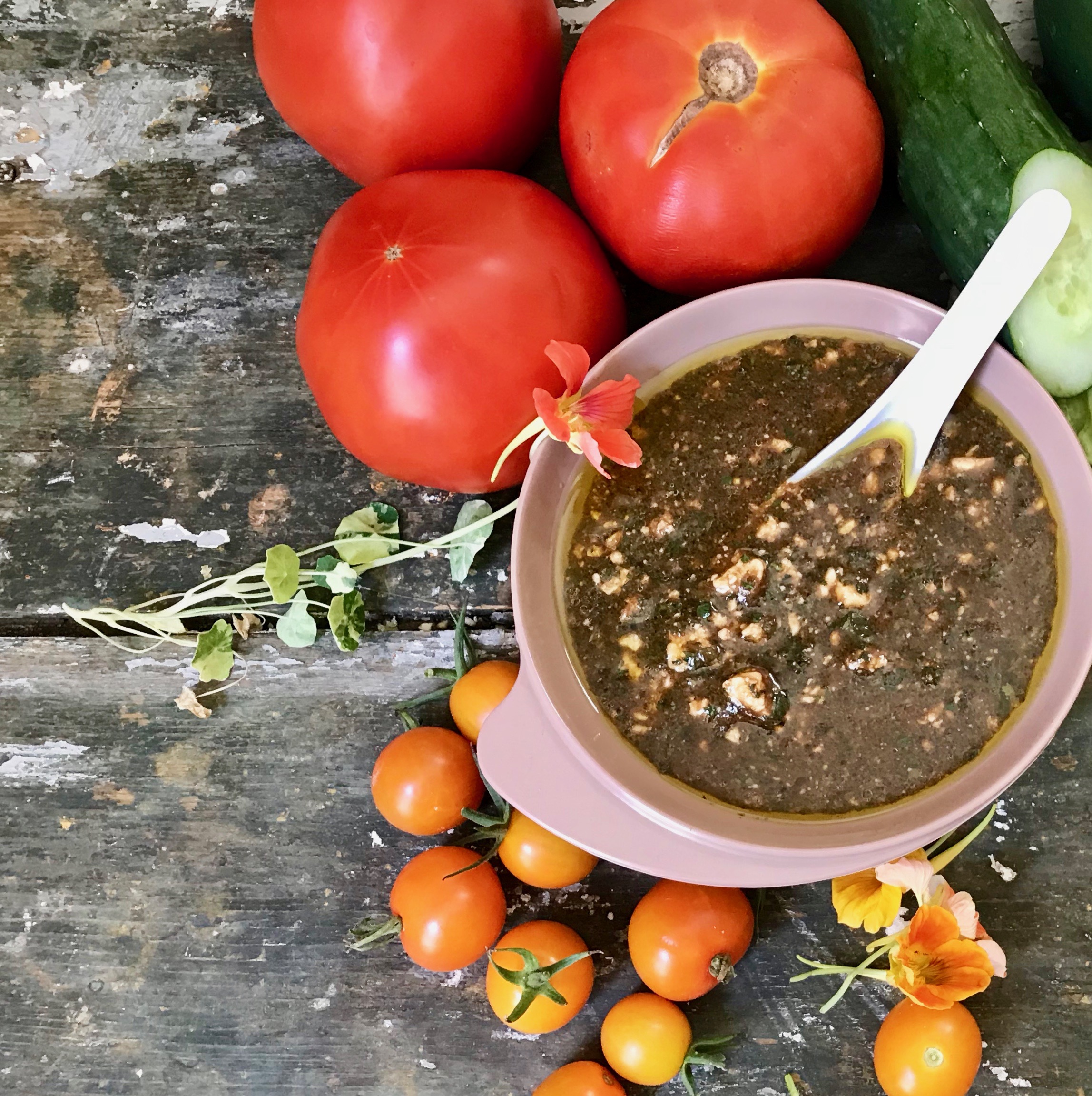 Not just a salad dressing, this could be a sauce for grilled veggies or proteins and combined with greek yogurt for a smooth topping for raw summer vegetables. Easy, versatile and no heat. Ahhh.