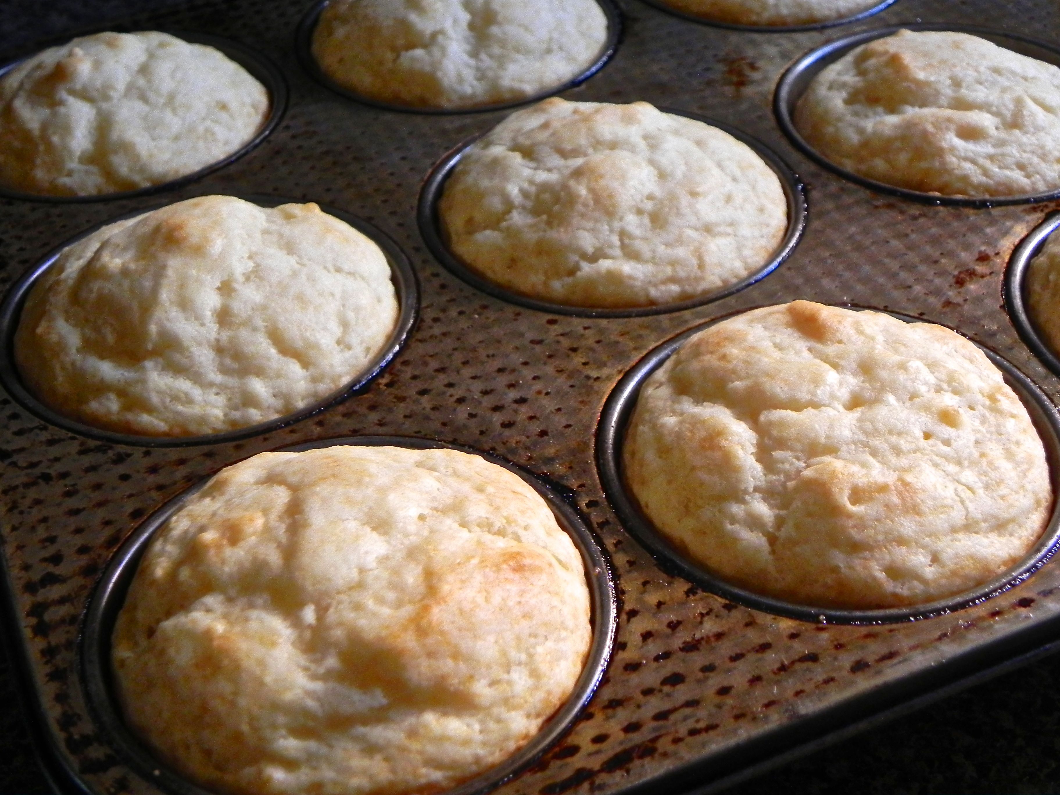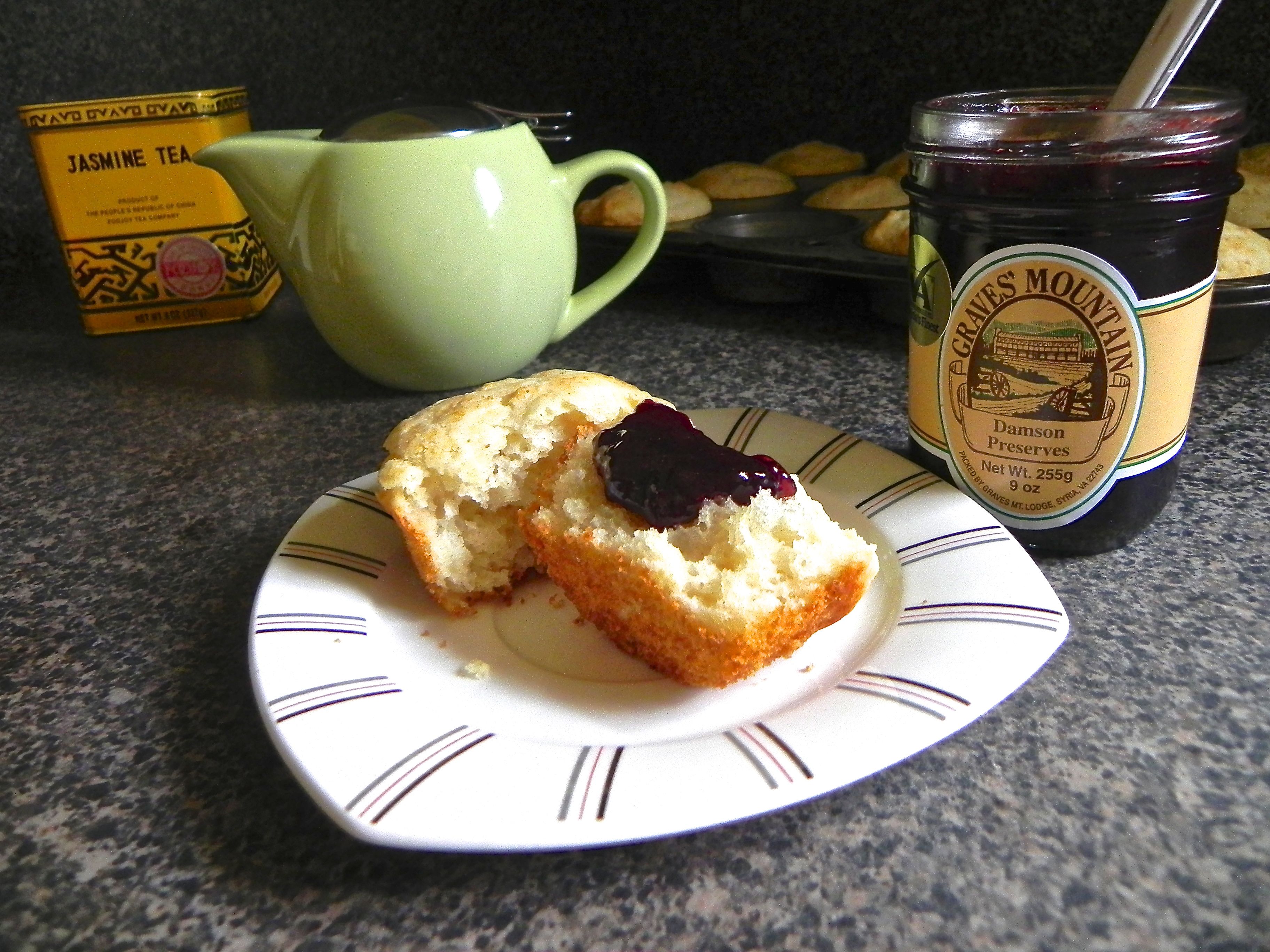 Wouldn’t it be great to build up your recipe repertoire with quick and easy items you can whip up on the fly, impressing your loved ones, your friends, yourself? See last week’s post about jazzed-up easy turkey meatloaf, or a recent post about homemade salad dressings. Today, I offer you a quick bread, adapted from the vintage American Woman’s Cookbook, where it was described as “Sally Lunn”. A similar recipe residing in my 1950s Betty Crocker Picture Cookbook (an excellent source for all baked goods ; those post-war home cooks rocked!) is generically categorized as simply “muffins”. Well, the name is plain, and if I am to be truthful, your recipe today tastes rather plain, too, but in a comforting way. A perfect foil for butter and jam; my preference is damson plum preserves by Graves Mountain Lodge in Syria Virginia, and purchased conveniently at our neighborhood market Little House Green Grocery on Bellevue Avenue here in Richmond.