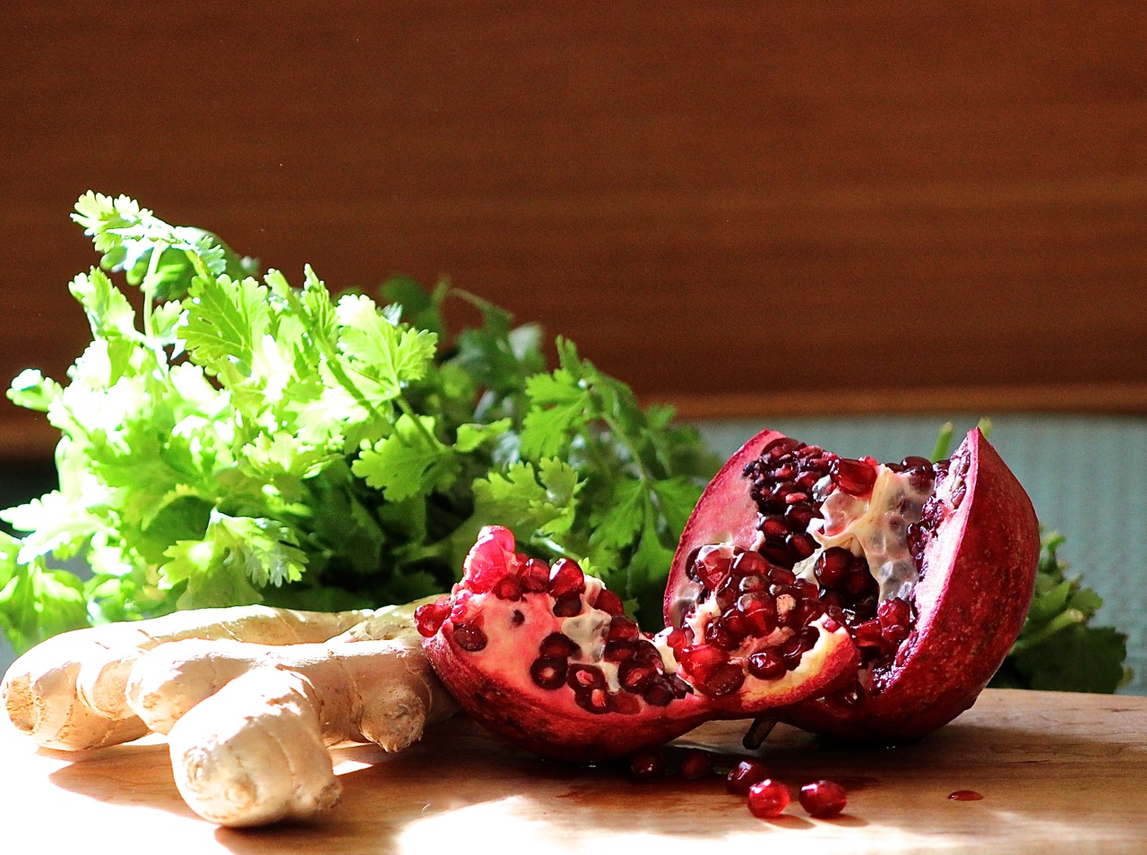 - Toss brussels sprouts in large mixing bowl with pomegranate seeds, cilantro and ginger.
