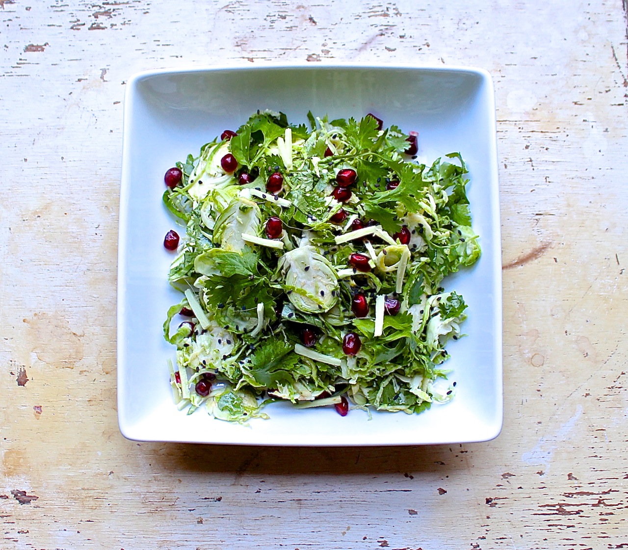 This brussels sprouts salad is open to interpretation: decrease the ginger if you can’t stand the heat, omit the cilantro and substitute another green herb, use toasted white sesame seeds if you are unable to find black. Cooking is meant to be an adventure, tailored to your tastes, and not a rigid travel itinerary.