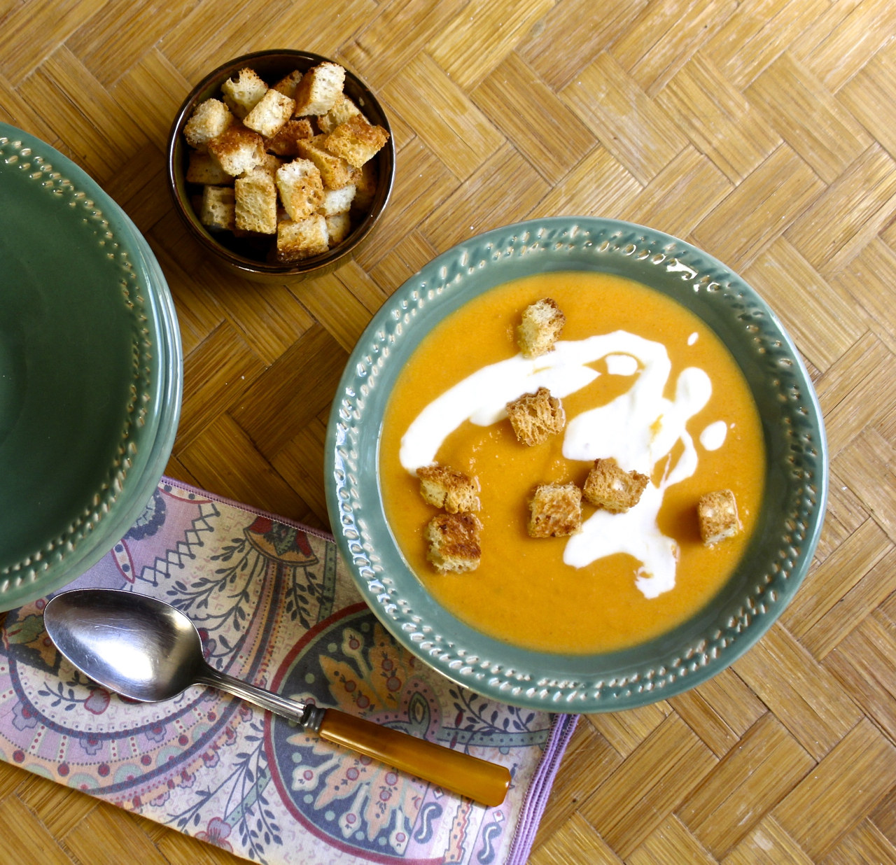 This soup tastes much better if made ahead and may be served chilled or at room temperature. A handy immersion blender will make it creamy (but you are welcome to use a blender or food processor; be careful of splatters and puree in batches). I have included directions for making the vegan version of the soup, and an easy recipe for garlic croutons to garnish, which may also be made ahead by several days.