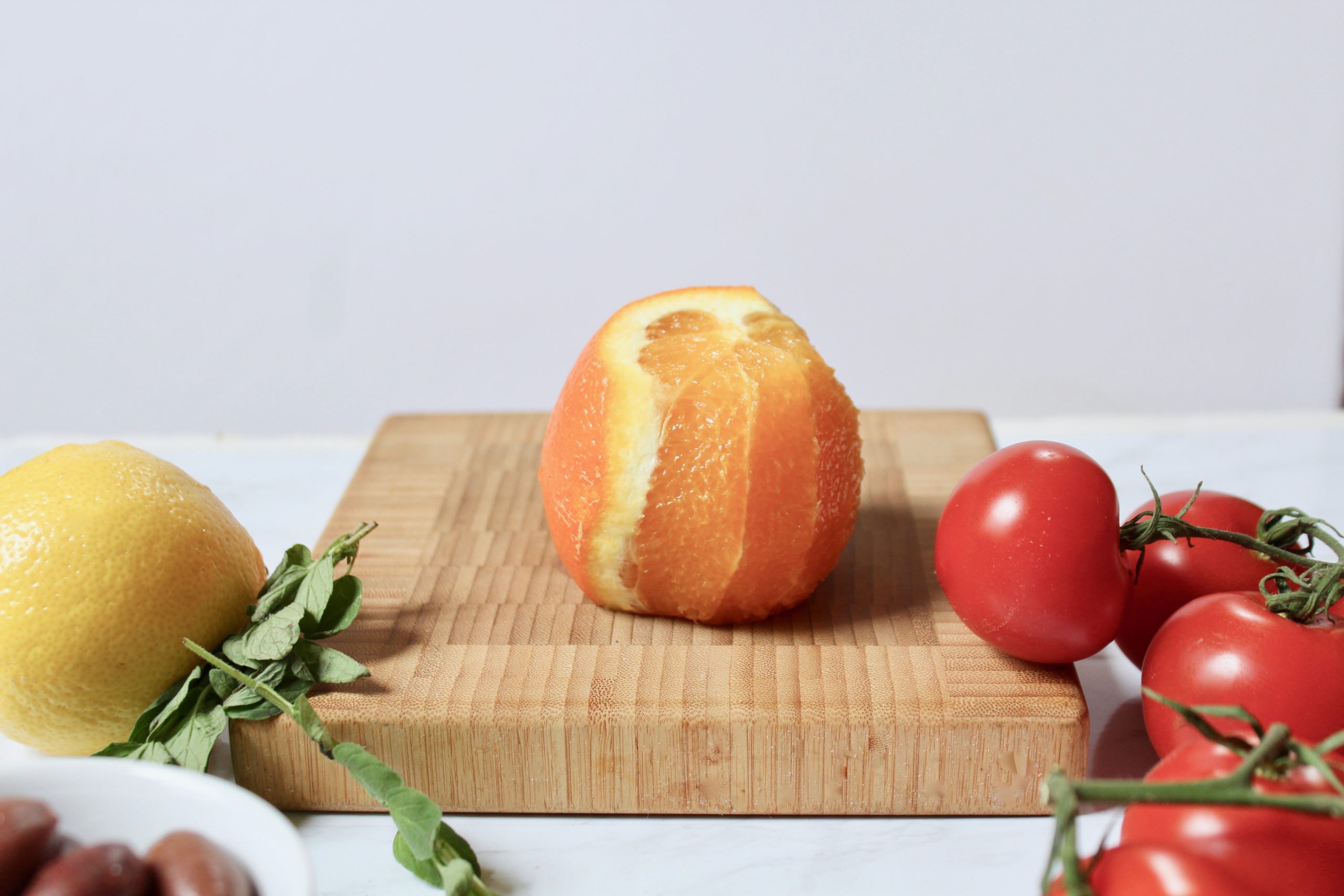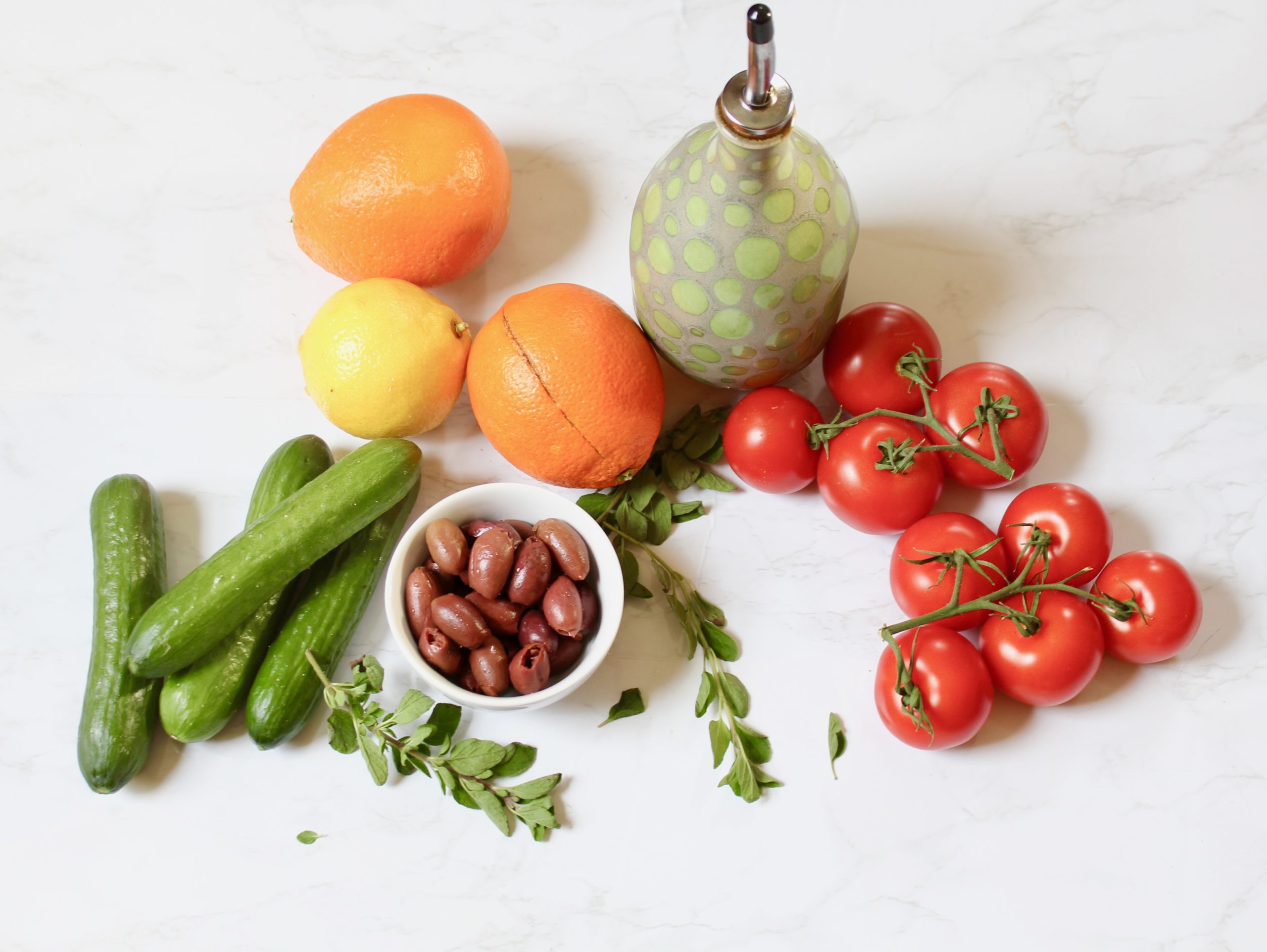 This is a deconstructed Greek Salad with all the right elements : tomato, cucumber, lemon juice, kalamata olives, oregano, feta cheese, onion (in the form of shallot) and extra virgin olive oil. What makes this seasonal is the addition of orange slices, a sweet counterpart to all that tartness and umami happening with the other ingredients.