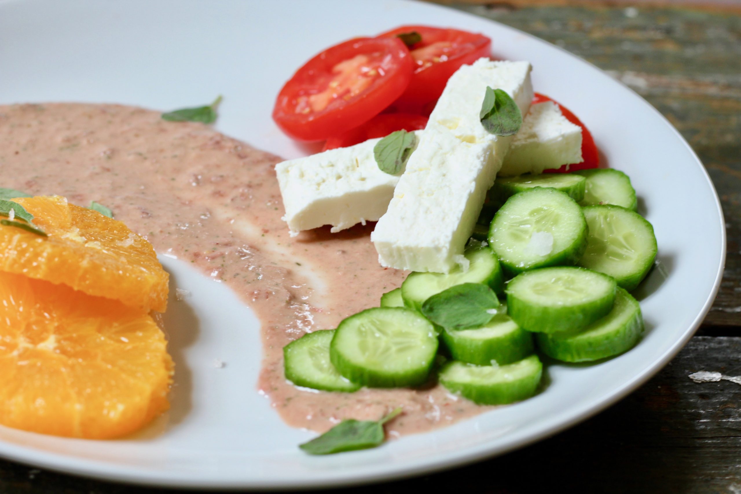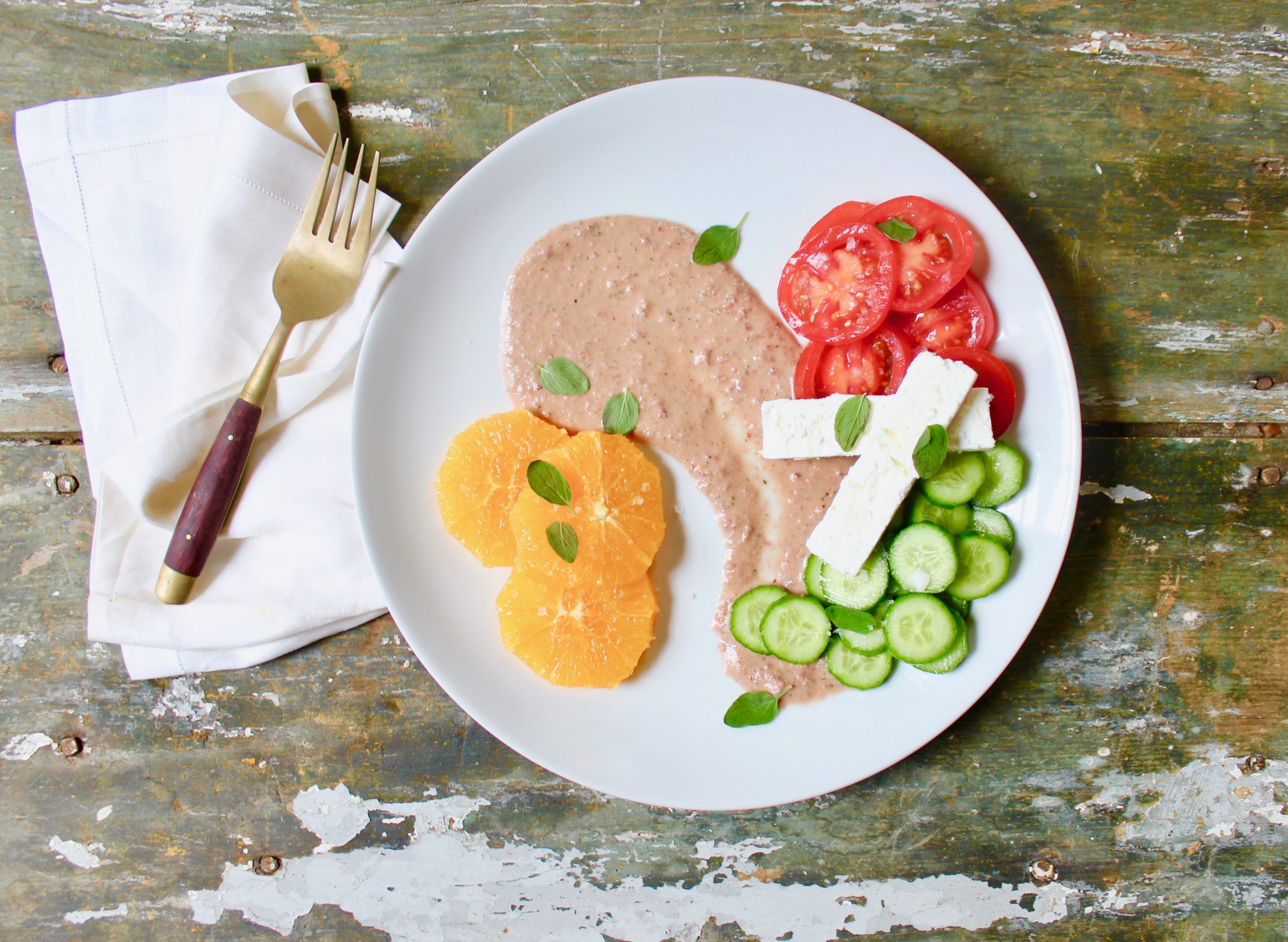 - At serving time, smear large spoonful of dressing on plate and place sliced tomatoes, cucumber and orange atop dressing.
