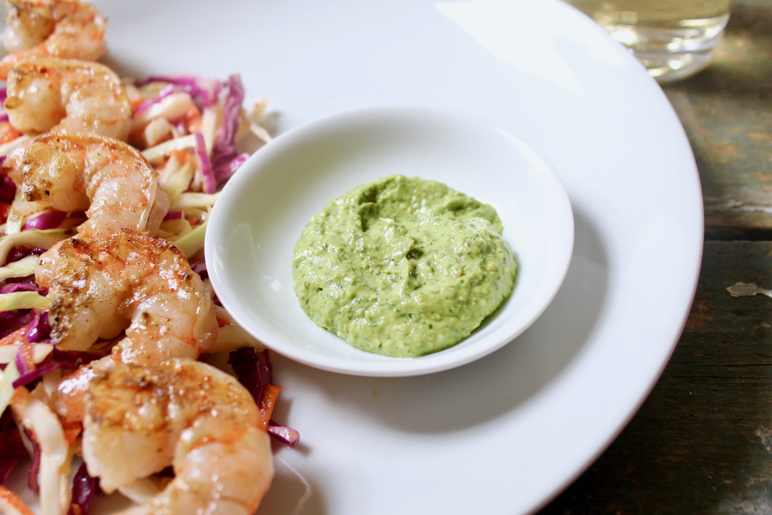 The sauce is made either in the small bowl of a food processor or in the beaker attachment of your stick blender (my personal favorite and most versatile kitchen tool – see Greek Salad with Orange and Strawberry Vinaigrette). Unlike guacamole, the sauce will not discolor for a couple of days and may be made ahead. The shrimp are not marinated but simply sprinkled with a chile lime seasoning like tajin or even a good quality lemon pepper. This light seafood dish tastes fine at room temperature, so grill ahead while you prepare rest of the meal.