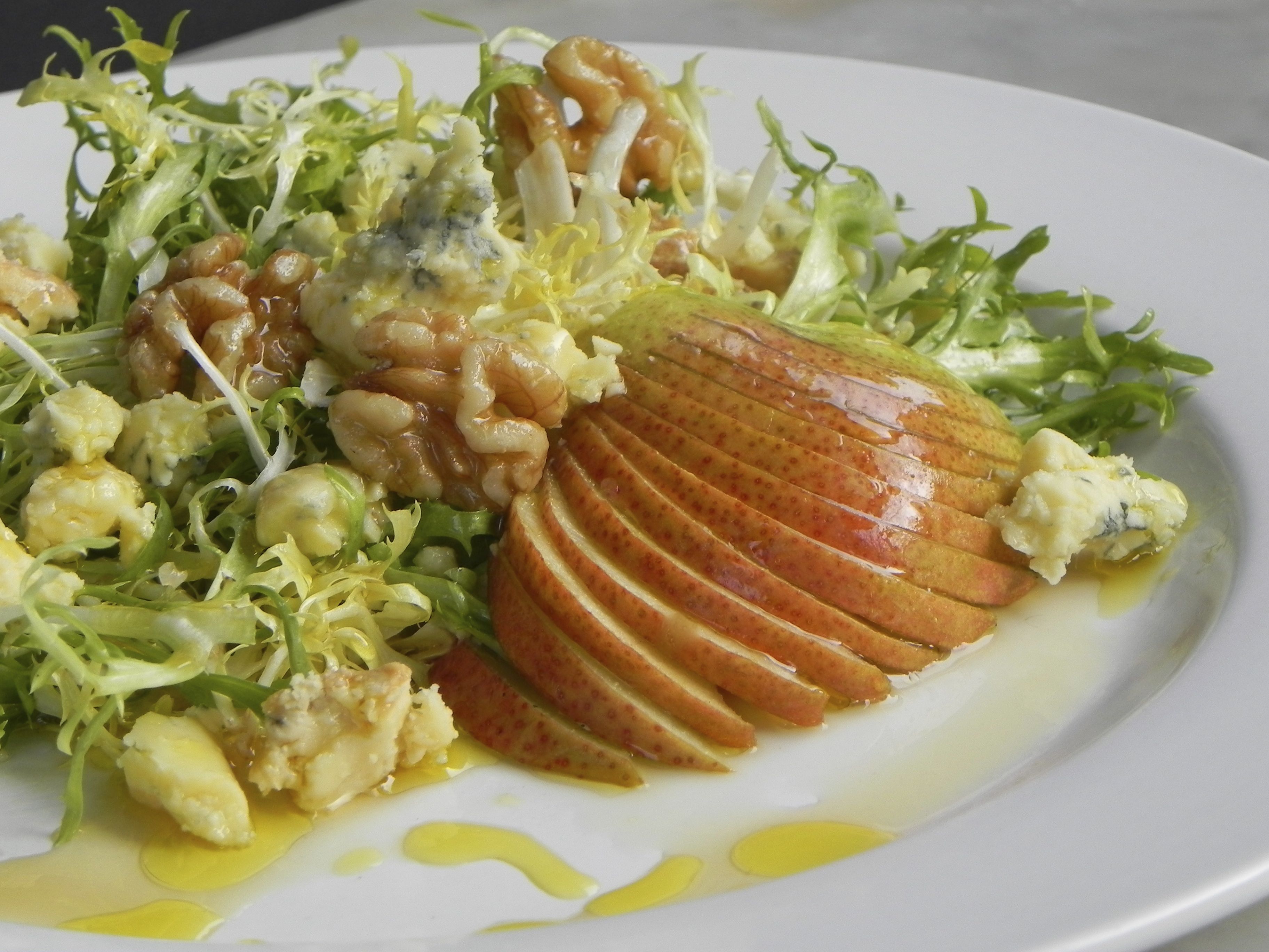- place pear halves atop frisee, then top with stilton and walnuts