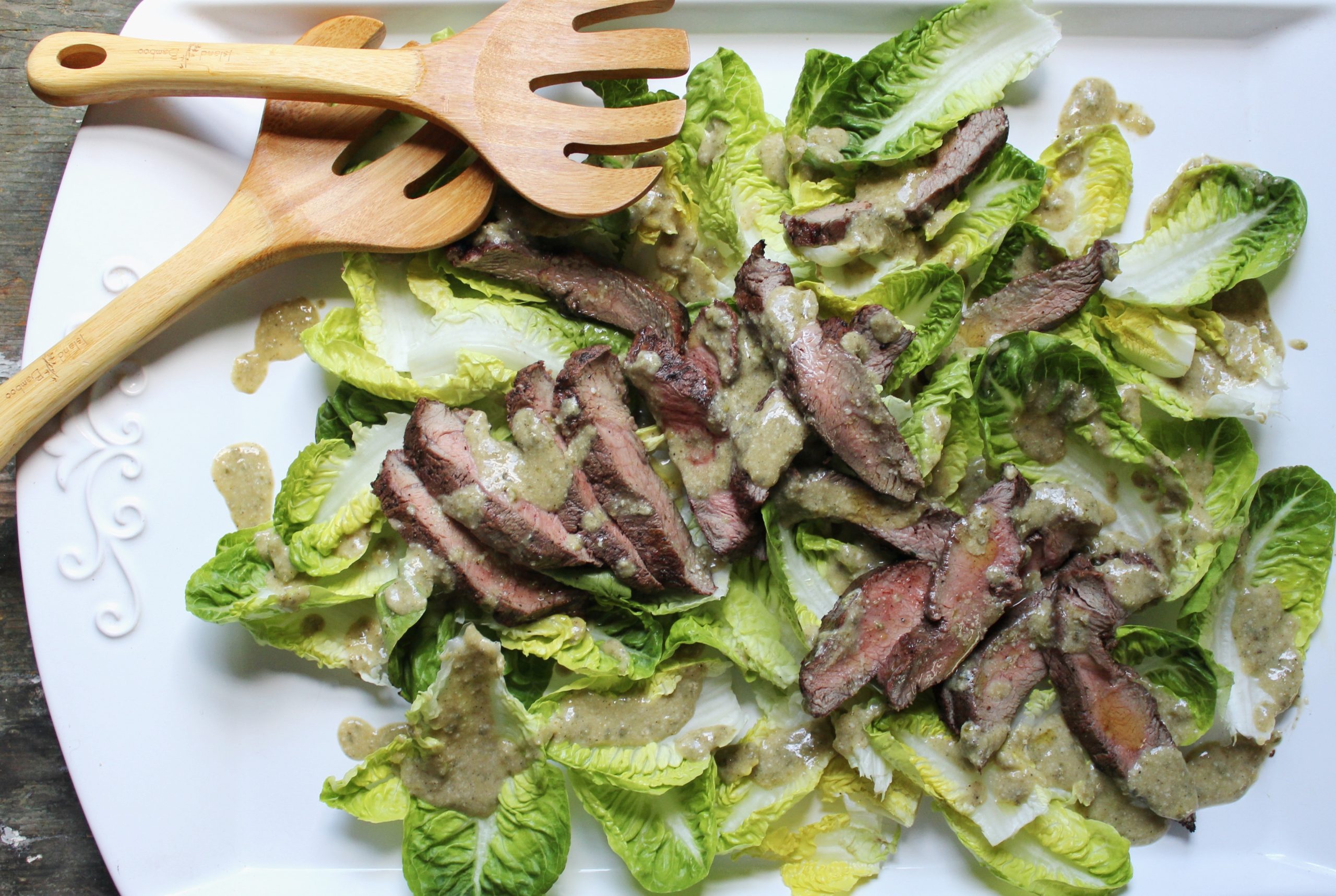 - Slice steak thinly on the diagonal and place atop lettuce.