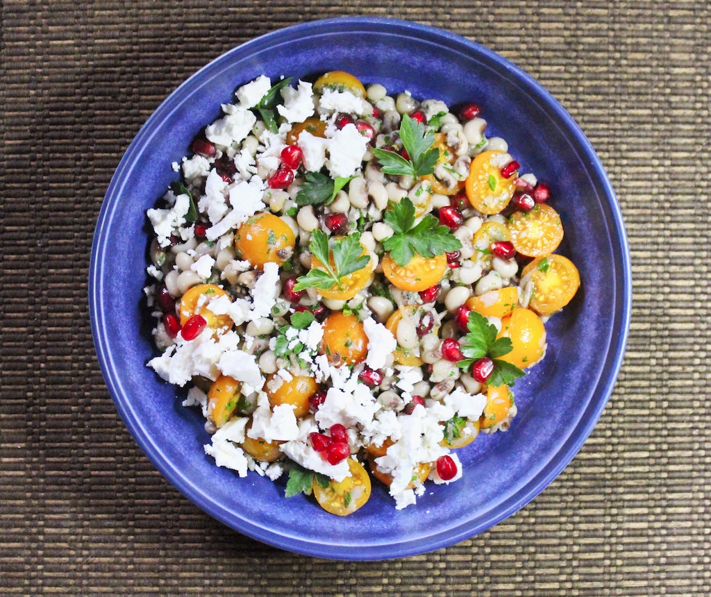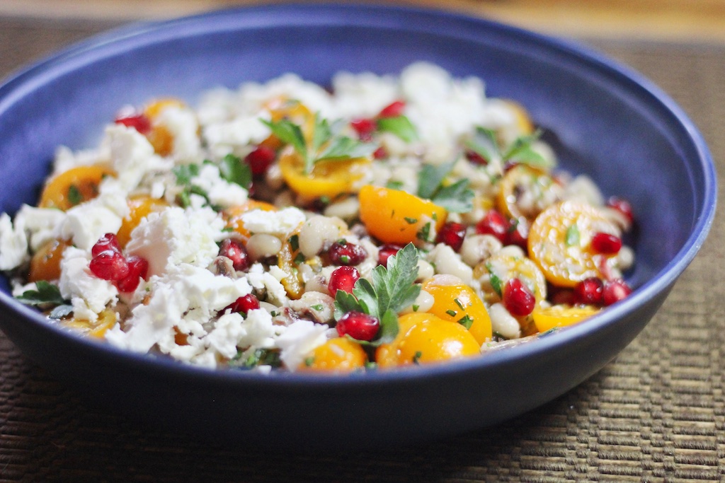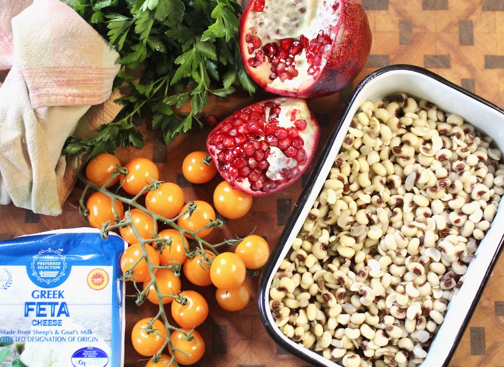 You can start your year right with this tasty and colorful southern staple. I’ve upgraded it to Mediterranean style with pomegranate arils, fresh tomato and parsley, olive oil and sheep’s milk feta. Rather than make a separate vinaigrette, you’ll simply toss zested garlic and red wine vinegar with the rest.