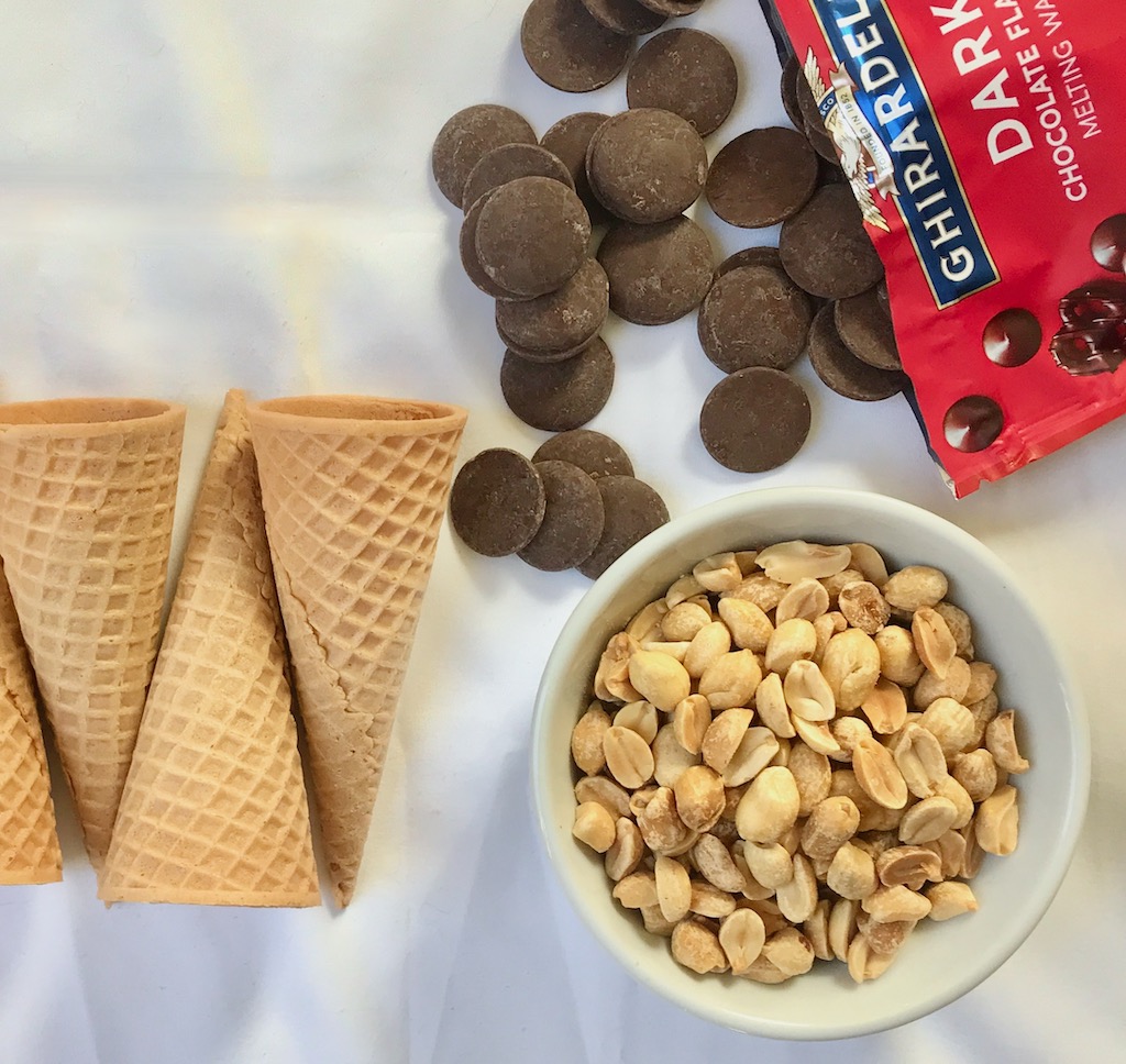 The ideal is to represent everything I craved. Notably, the ice cream recipe should include : chocolate, sugar cones ( I like Joy brand gluten free), peanuts and creamy, slightly salty, vanilla base.