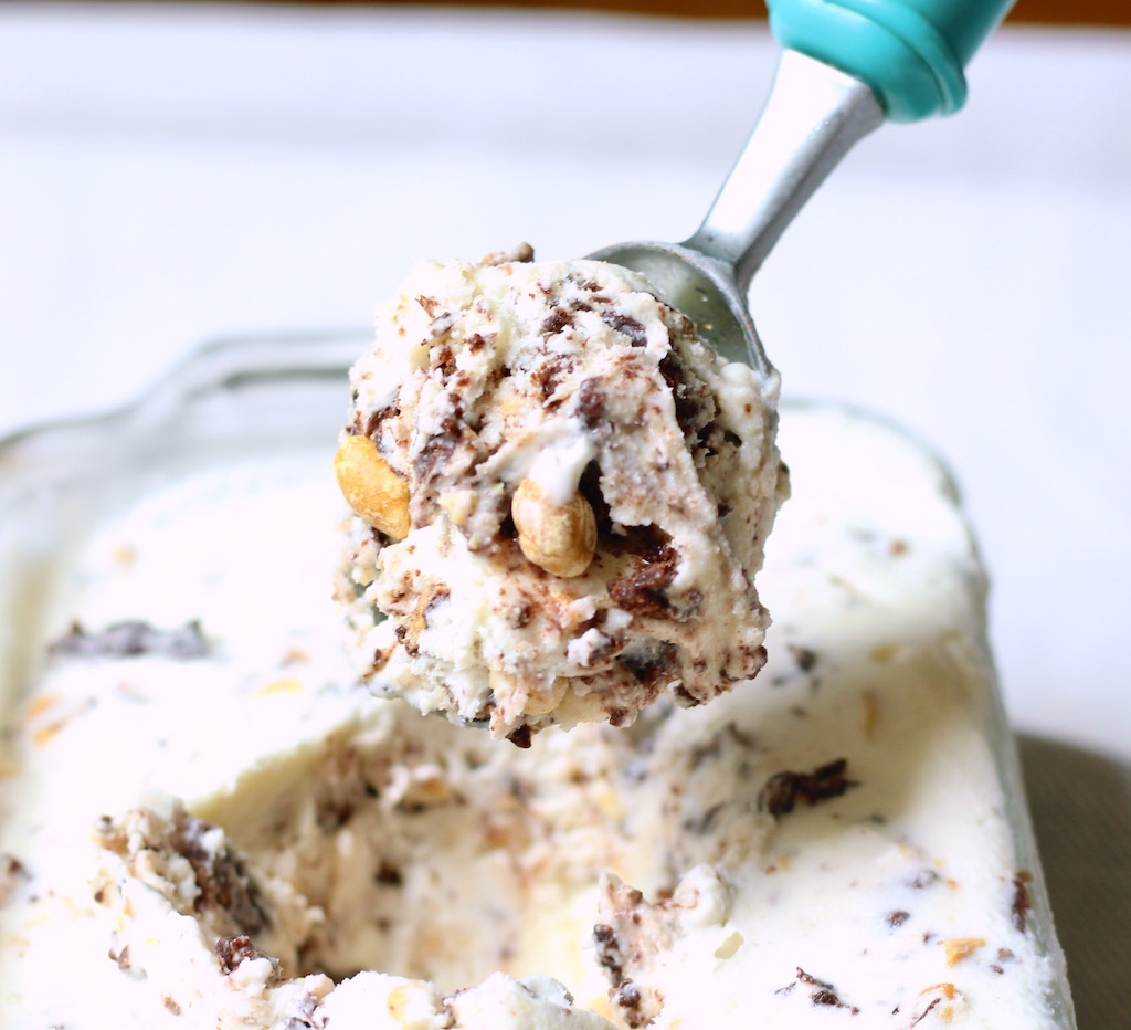 - When ice cream begins to resemble soft serve, after about 20 minutes, add the peanuts and chocolate coated cone bits, a handful at a time, until they are incorporated.
