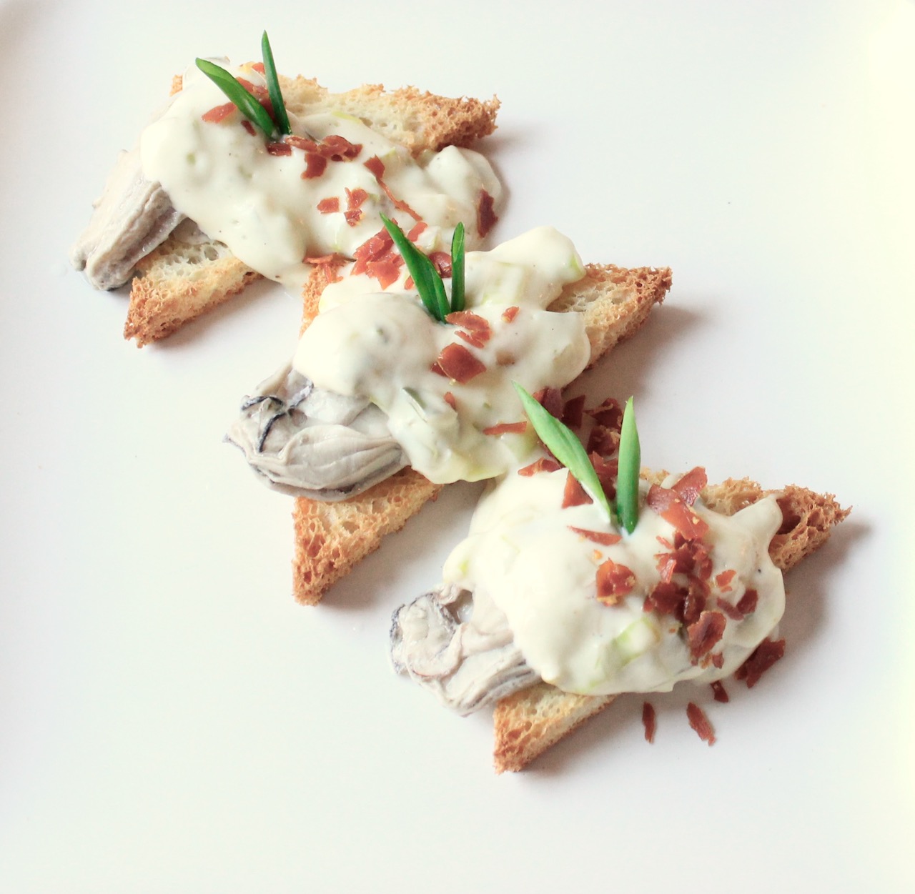 - To plate, place one oyster atop each triangle (three per serving), top with warmed leek cream and then top with frizzled prosciutto.