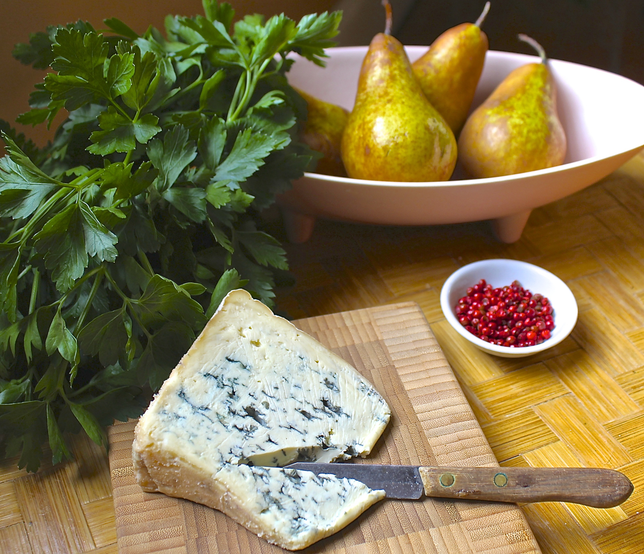 The celery-like taste of Italian parsley makes a great foil for salads with fruit, which can taste too much like dessert if left unchecked. This parsley pear salad has nicely contrasting flavors and textures, with a creamy, chunky blue cheese dressing dabbed over parsley leaves and wedges of Bosc pear, and dotted with pink peppercorns and chopped walnuts. Simple, and simply good. Something you can put together at the last minute and make your dinner guests think you have been slaving away in the kitchen just for them. Well, you have been in the kitchen, but playing with your food like the good foodie you know yourself to be.
