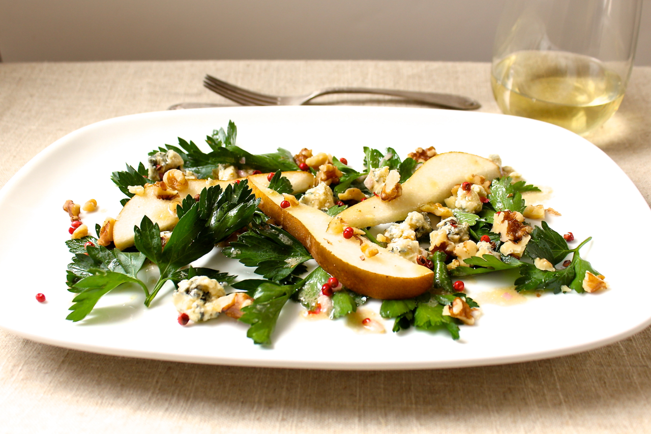 Most of the recipes I share with you have some make- ahead components, but the dressing is made with extra virgin olive oil and will thicken considerably with refrigeration, leaving it too stiff to drizzle. You could cut the pears ahead and rub with lemon to prevent discoloration and wash the parsley ahead of time, but….this salad is so easy, so very easy, that last minute preparation is a cinch. Time to play with your food.