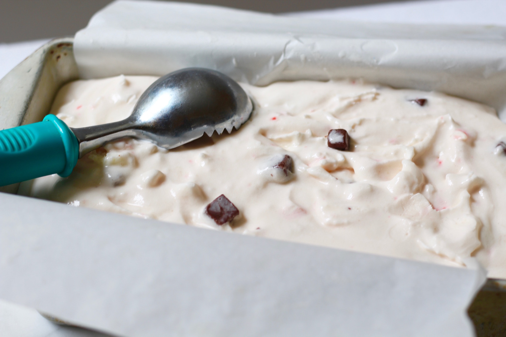- Add peppermint candy bits quickly but gradually, then add most of the mint fudge bits, a couple at at time to avoid clumping, then once mixture has thickened well and motor seems to slow, turn off machine and add remainder of fudge bits. If your mixture gets thick quicker, you may be able to only add about half the bits before needing to stop the machine – just add the rest once it stops.