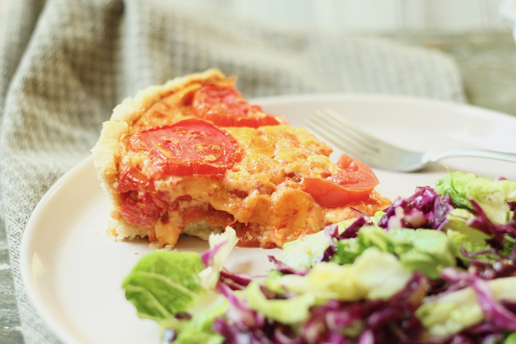 - Scatter ⅓ cup cheddar across tart bottom, then tomatoes in even layers.