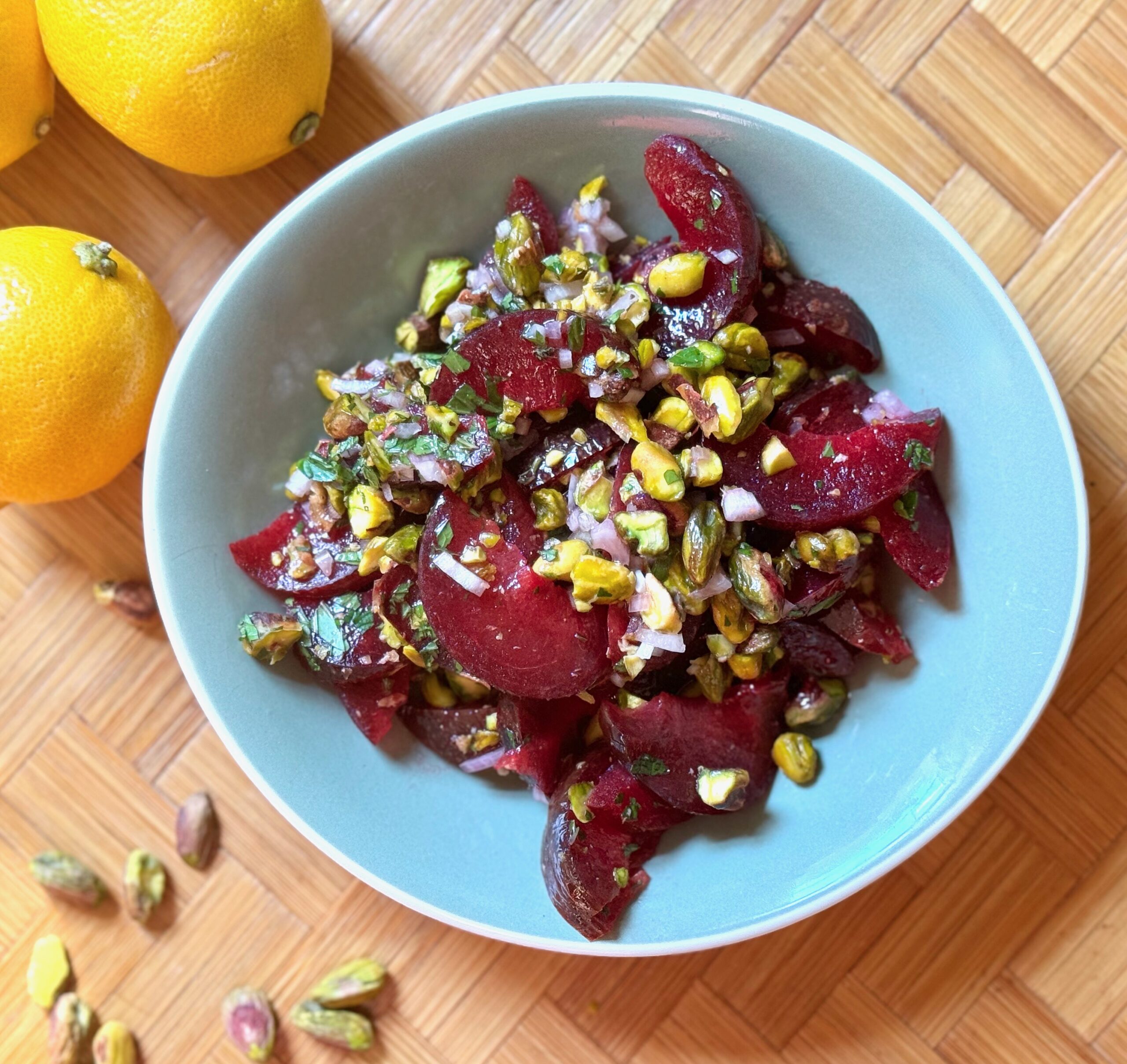 I have an abundance of mint, so my version includes chopped mint. Basil, parsley and oregano are also welcome. No lemon juice? Lime is just fine. My preference is raw pistachios over roasted, for creamier texture and bright flavor. Why not use walnuts, pecans or cashews? Kitchen improvisation is the mark of a good cook. And because you are reading this short story, consider yourself a good cook!