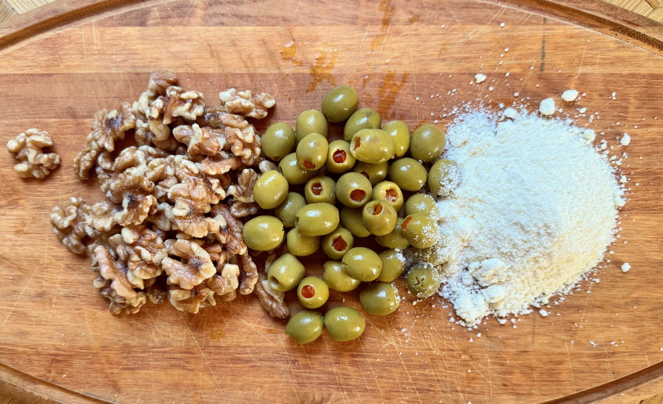 - Combine walnuts, olives, parmesan cheese and olive oil to make a paste.
