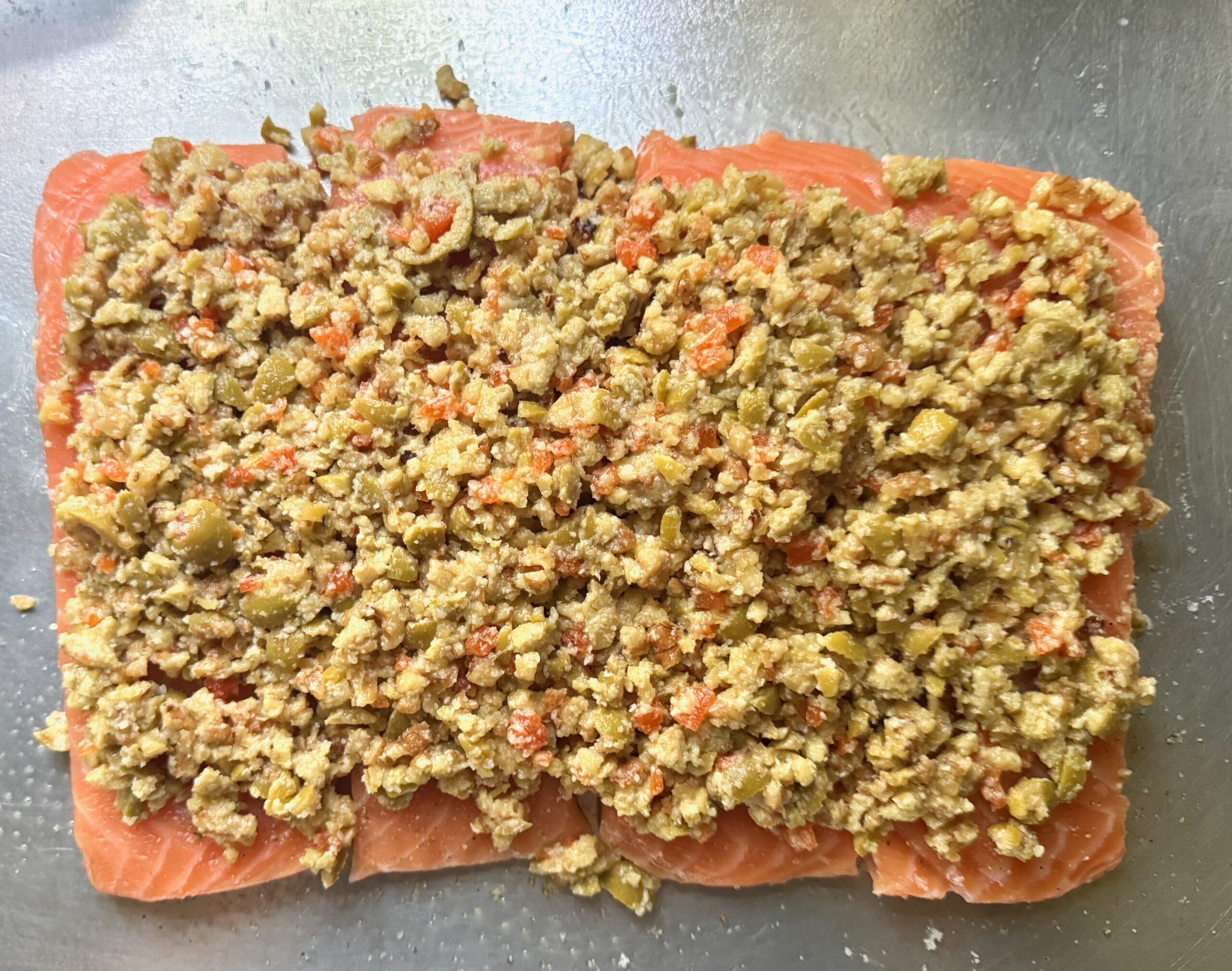 Improvise to your taste. Less green olive means more walnut. Use other nuts like pecans or pine nuts. Black olives are a good substitute. Obviously if salmon is not your thing, use your favorite fish fillets.