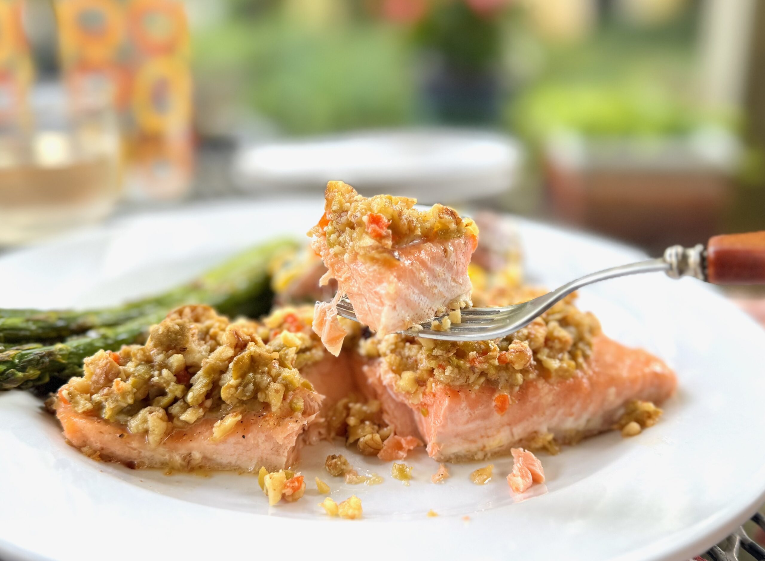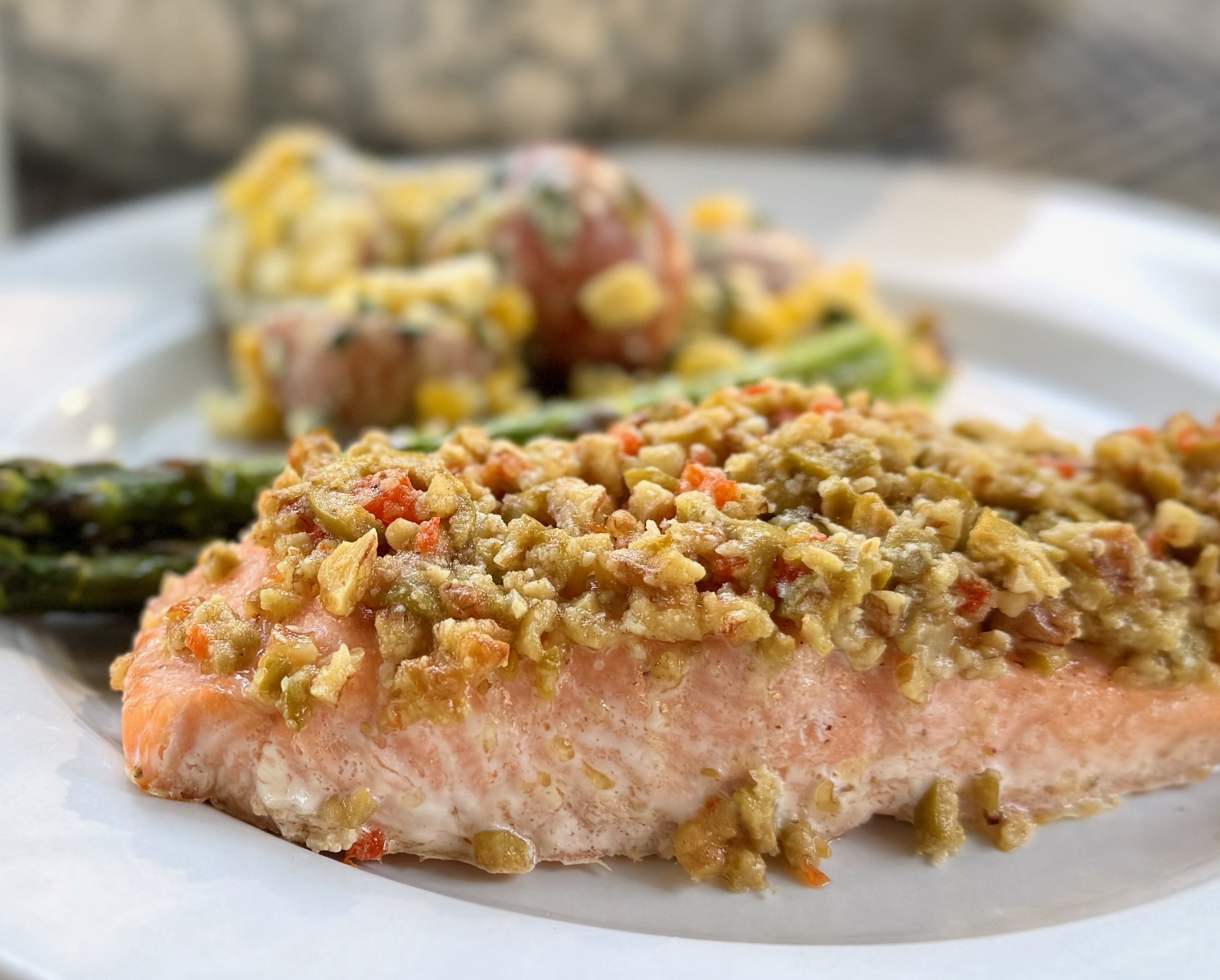 Perhaps you’ve had your fill of turkey. Your evenings are busy with holiday preparations. You love the idea of a clean meal, simply prepared. Tender roasted salmon topped with a walnut green olive pesto is the answer to your question of what to eat for dinner on the quick.