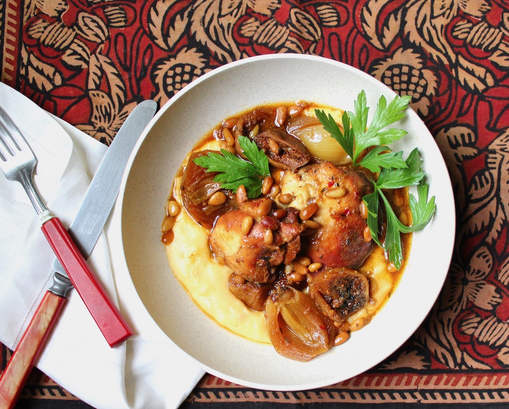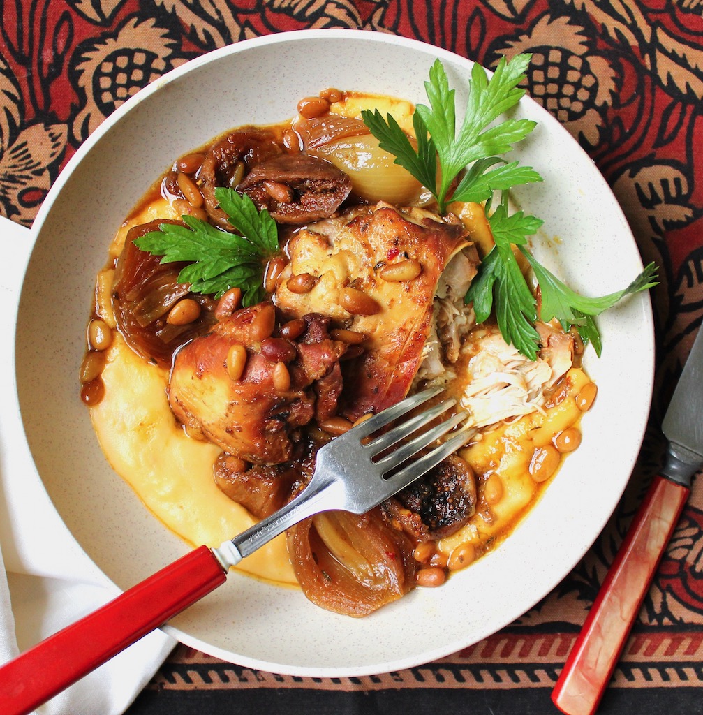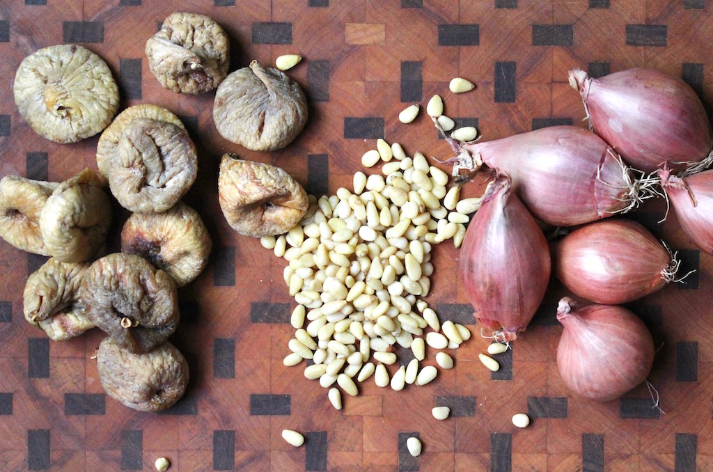 I trimmed the dried fig stems and kept the shallot root end intact for shape. Untoasted pine nuts transform into something heavenly when braised with sauce, chewy yet tender.