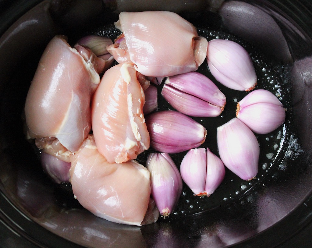 - Arrange shallots, cut side down, on bottom of crock, followed by chicken thighs.