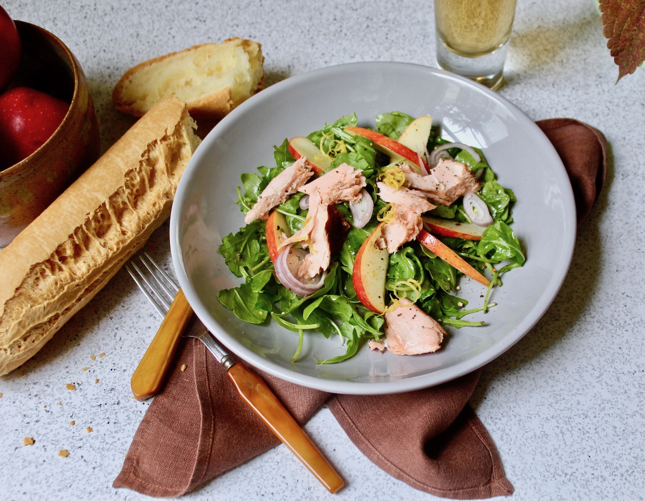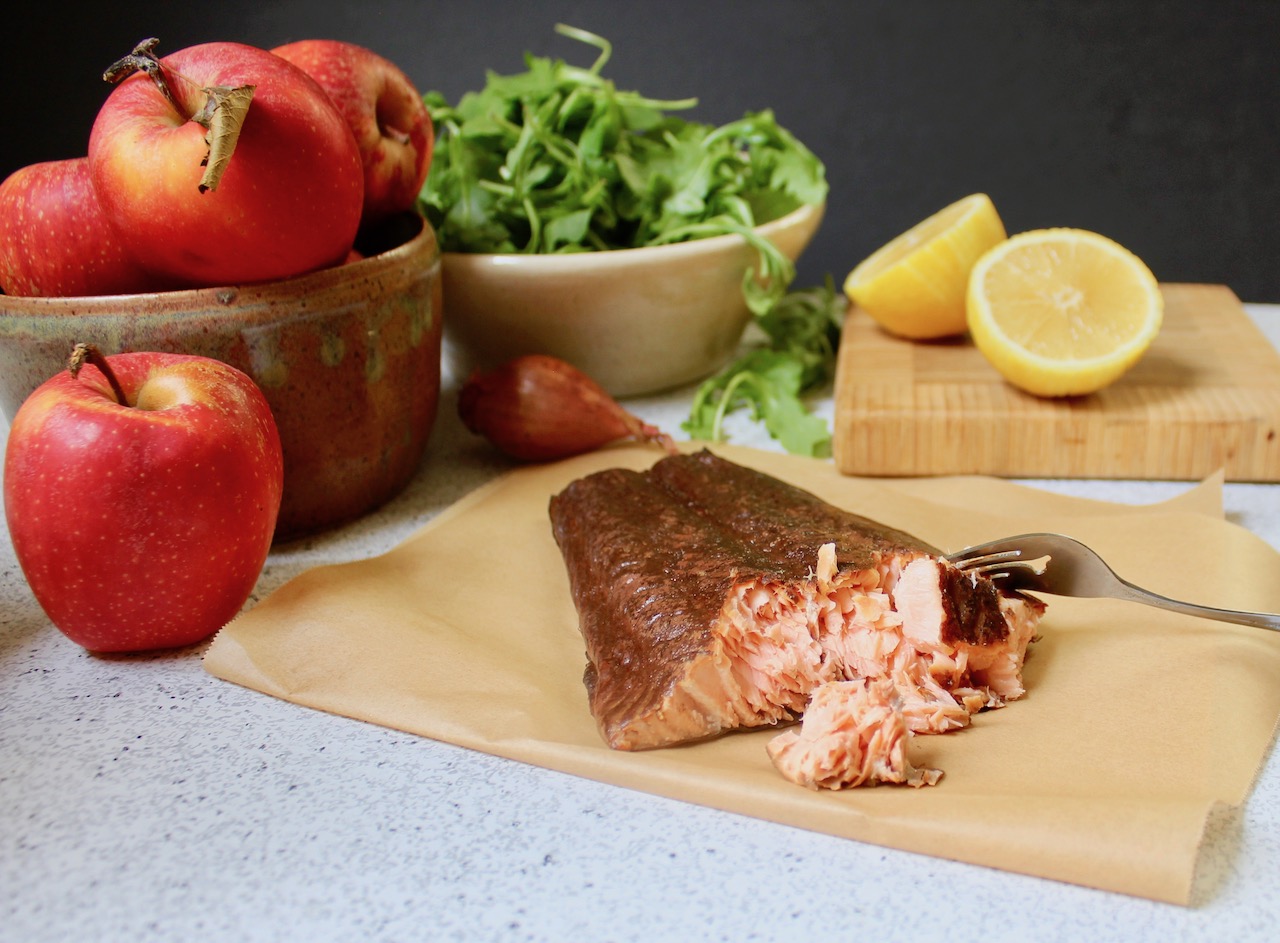 A little smoked salmon goes a long way. Especially if the salmon is high quality in-house smoked salmon from your local fishmonger, like the burnished slabs found at Tuckahoe Seafood here in Richmond. In this Smoked Salmon Apple Salad the rich smoke taste is offset by the crisp of Virginia apple, earthy baby arugula and a sweet-tart lemon maple mustard vinaigrette.