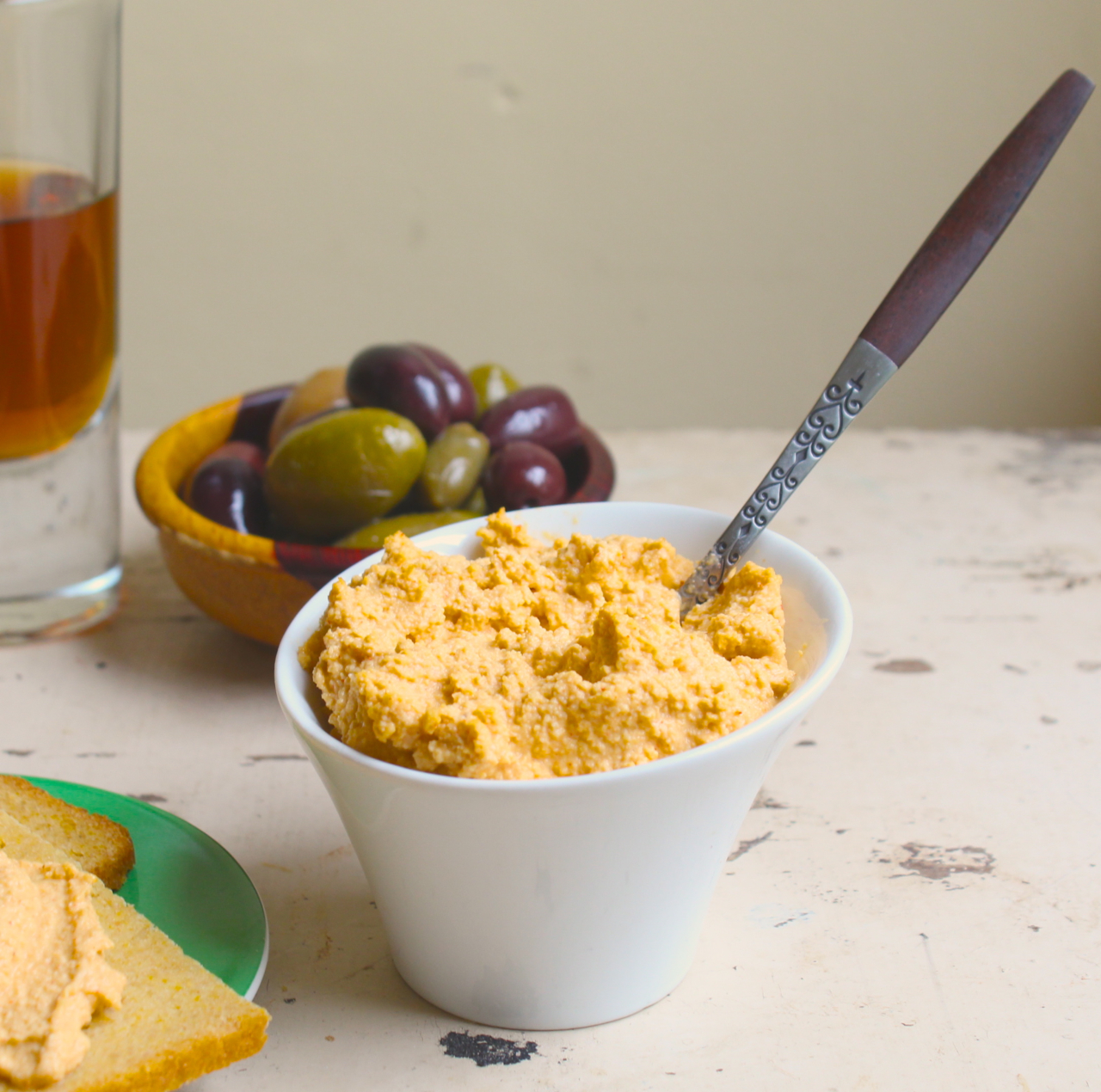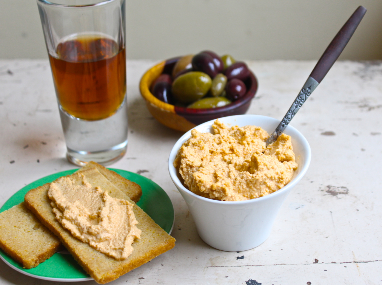 I’ve been reading about and thinking about vegan cheeses made with cashews and today’s recipe is the result of much playing around in the kitchen in order to get it right, and trying to duplicate that terrific spread. Most vegan cashew cheese recipes start with raw cashews, but I used roasted nuts to complement the smoked Spanish paprika and give not only depth of flavor but a pleasant color. Lemon juice for tartness and a hefty dose of raw garlic give a blast to your tastebuds, and the flakes of nutritional yeast lend the umami facsimile of aged cheddar. Nutritional yeast is easily found in the bulk bins of natural food stores and it keeps well at room temperature.