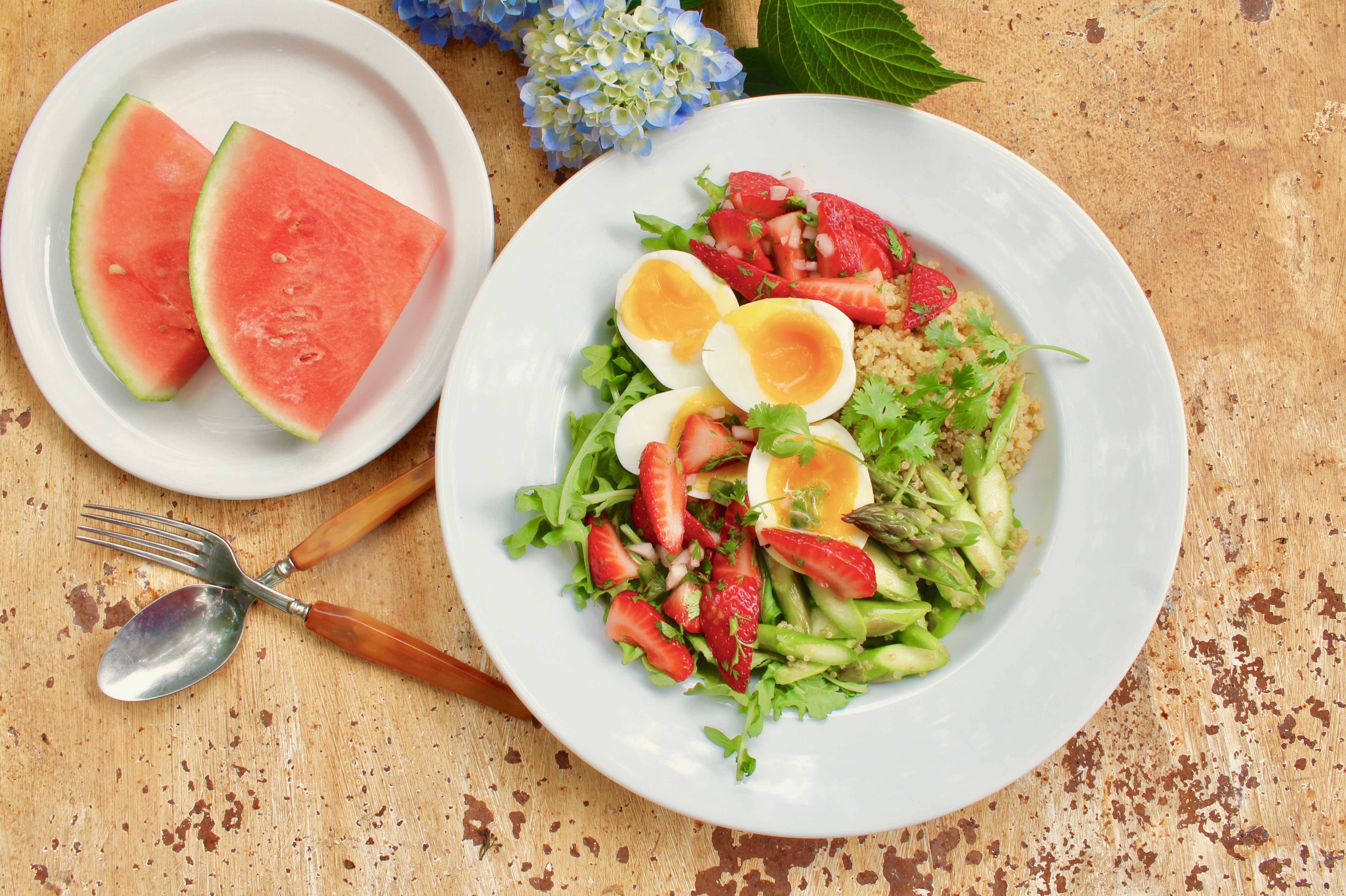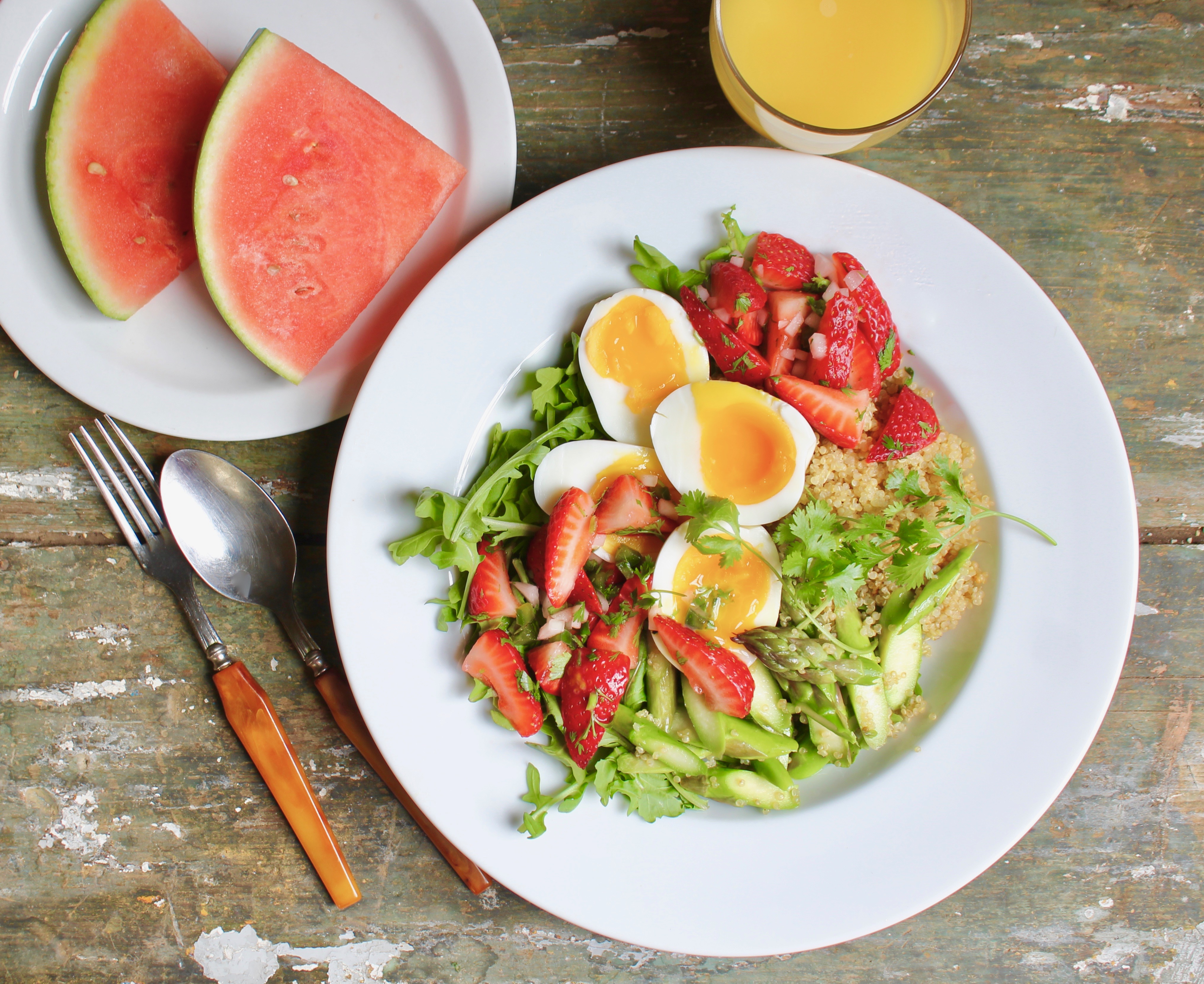 - Divide arugula between two large shallow bowls, top with quinoa, asparagus and strawberry salsa, then peel and cut the eggs horizontally, placing them over the rest and sprinkling with coarse salt if desired.