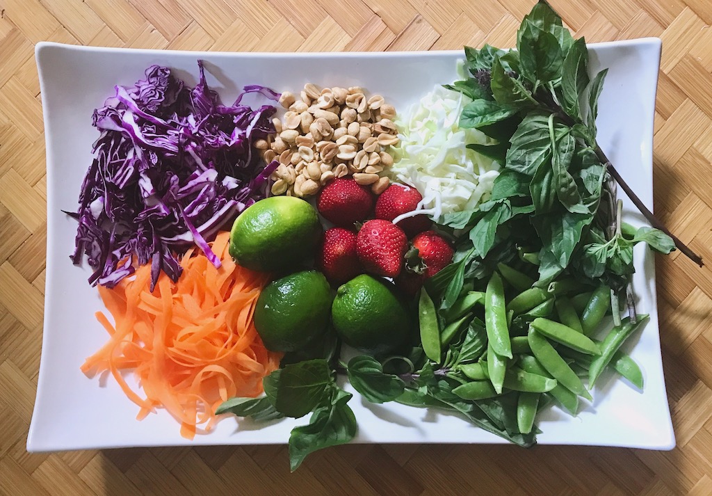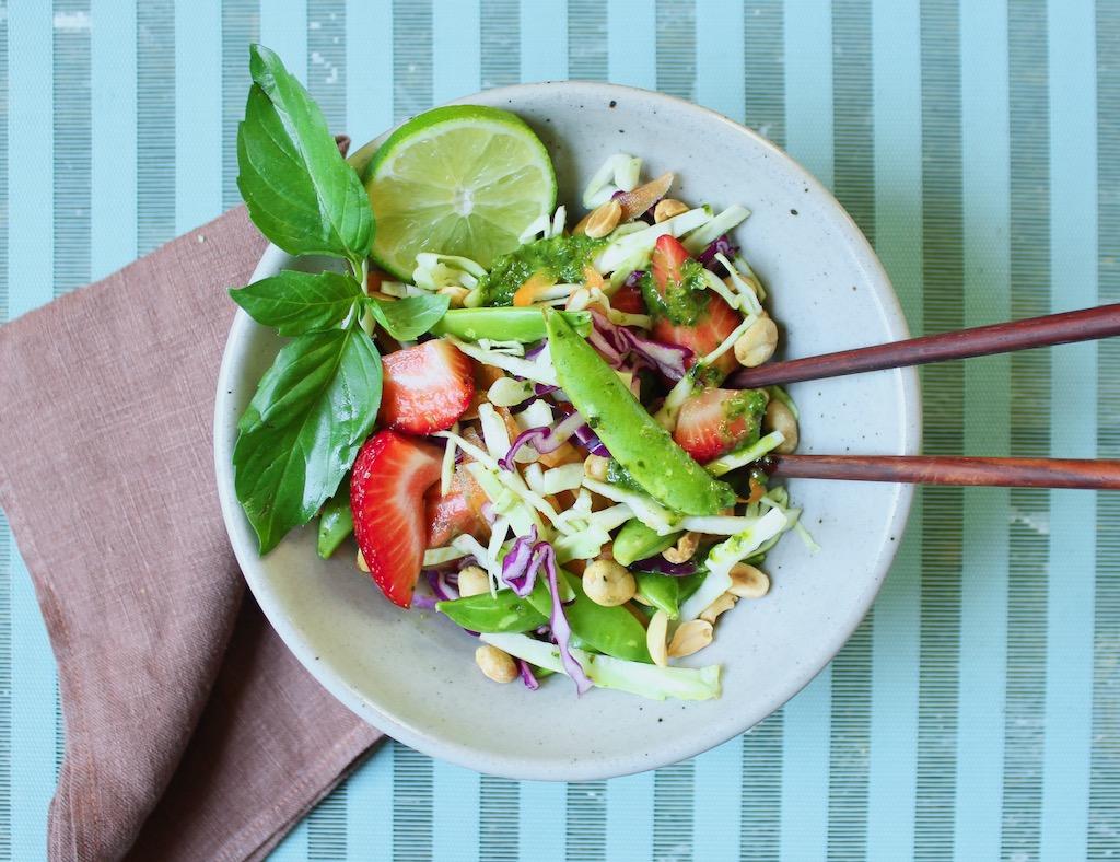 Spring salads lead to lighter eating for the upcoming summer season. It’s time to step away from heavy foods and crunch into bright, crispy seasonal fruits and vegetables. This Strawberry Sugar Snap Salad has plenty of color and crunch. Moreover, the heady Thai basil dressing and peanuts take this pretty salad in a more exotic direction.