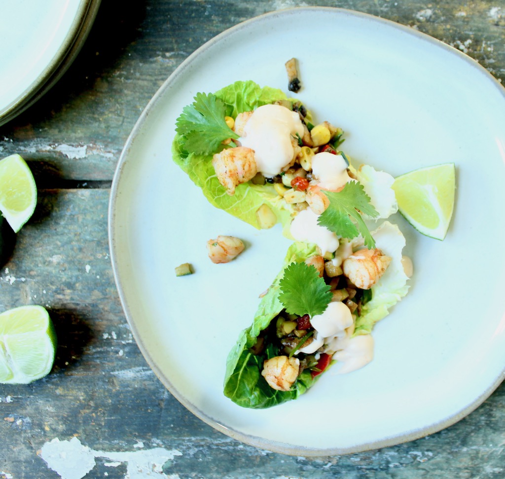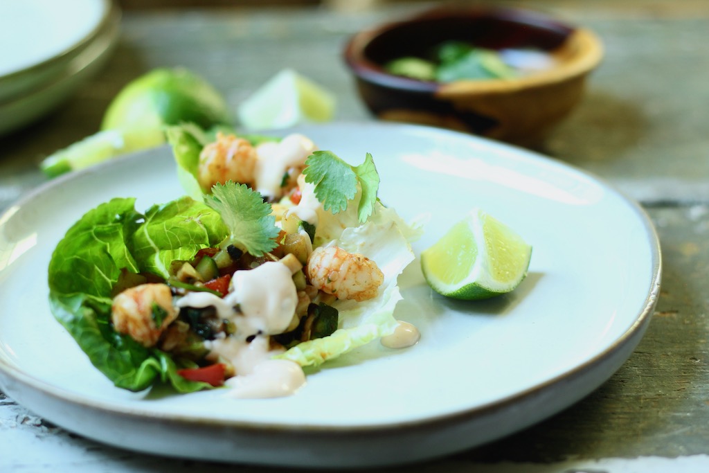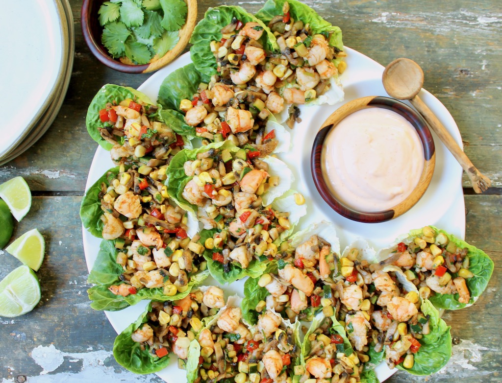 Eating light and cooking minimally go together well. This recipe for shrimp and summer vegetable lettuce cups is colorful, light, easy and versatile as appetizer or entree. You can also customize for spicy heat, types of vegetables and different proteins. Use this as your summer template.