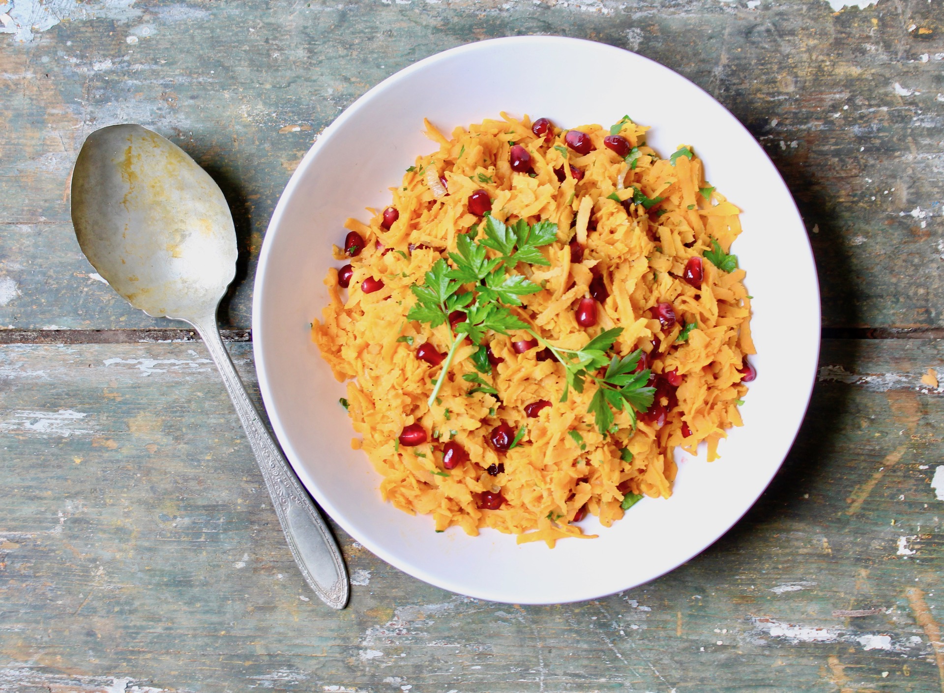 This sweet potato pilaf is for everyone who loves the idea of adding sweet potatoes to their diet, but will enjoy them more without all the sweet hoopla of brown sugar and marshmallows. There is a bit of sweet tartness with the addition of pomegranate seeds, but not a smidge of sugar in sight.