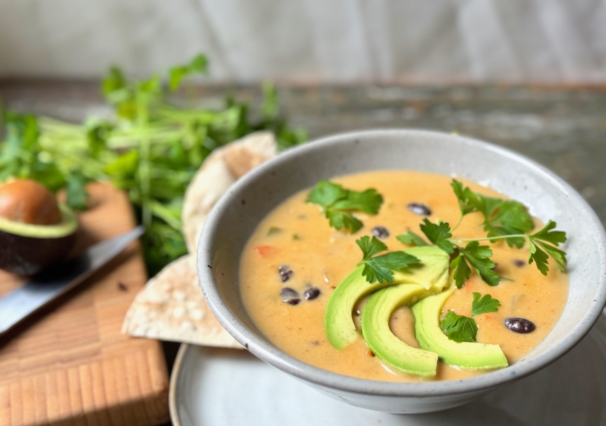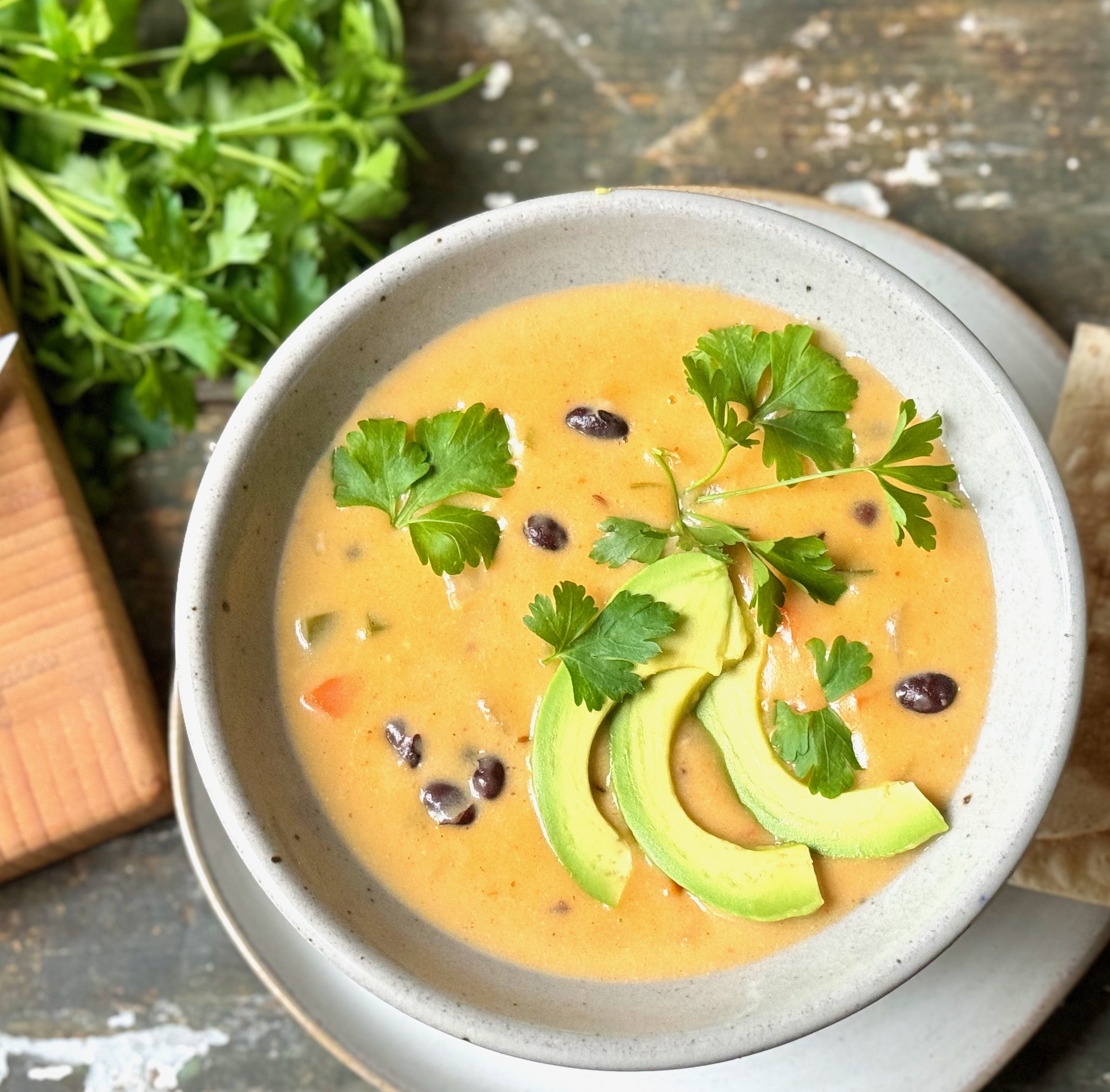 Black Bean Cheese Soup is loaded with colorful vegetables. Mexican blend cheese melts well and pre-shredded gets the prize for convenience.