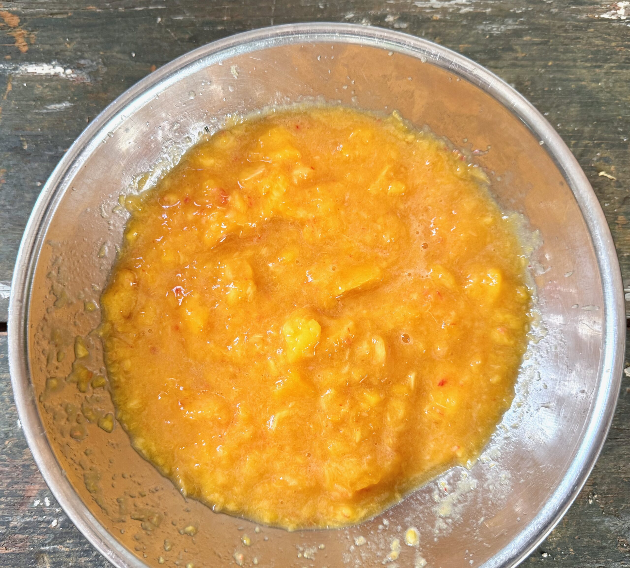 - Use hand blender or food processor to make the peaches into a chunky puree; you should have 2 cups.