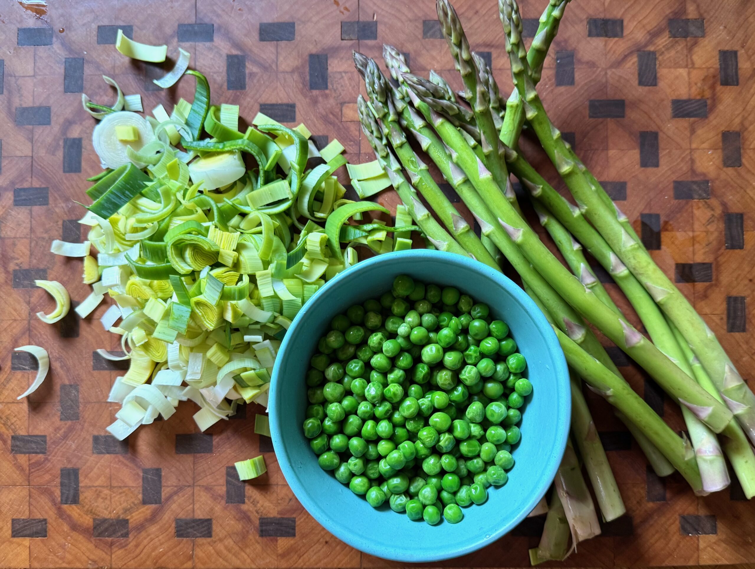 Generally you’re counseled to use only the tender light green parts of leek. For less waste and more hearty leekiness, I include some of the dark green as well. Frozen peas are packaged at their peak and are usually more tender and flavorful than local peas, which thrive in cool climates, have a short season and toughen quickly.