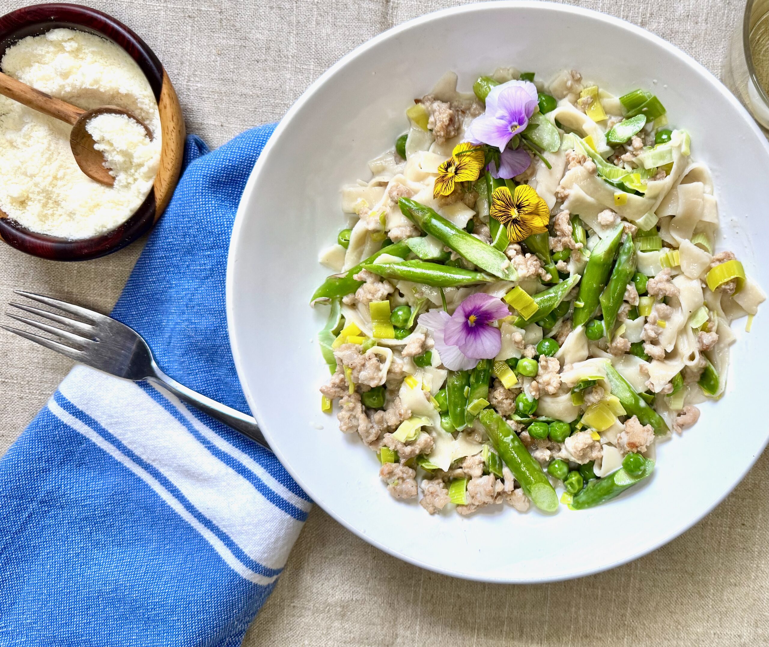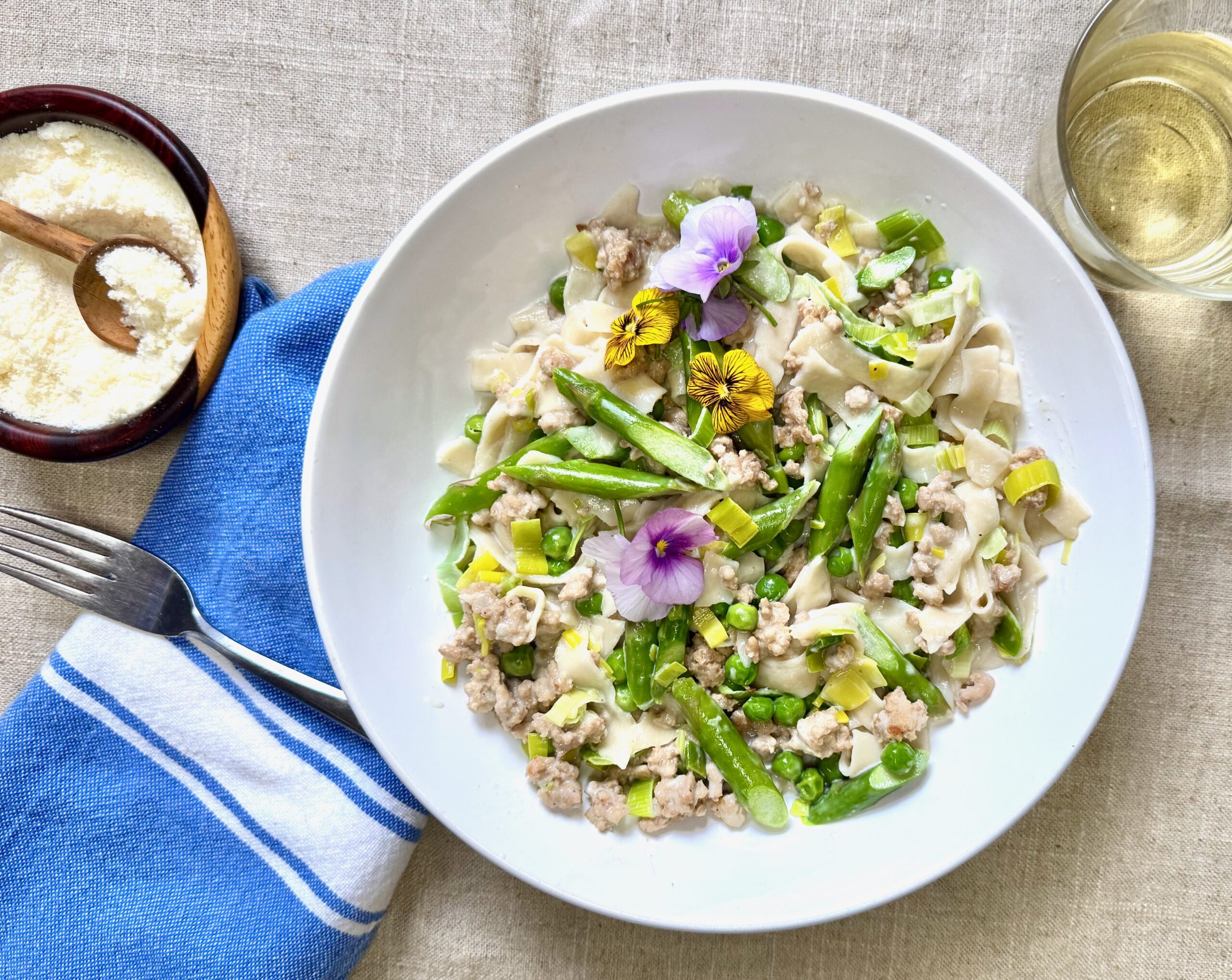 Grab some local asparagus if you’re able. Go for thicker spears, what all chefs love for their superior flavor and texture. Skinny asparagus is all the rage, which is a darn shame. Although not a big pasta person, the heady combination of pasta with asparagus brings me to the table.