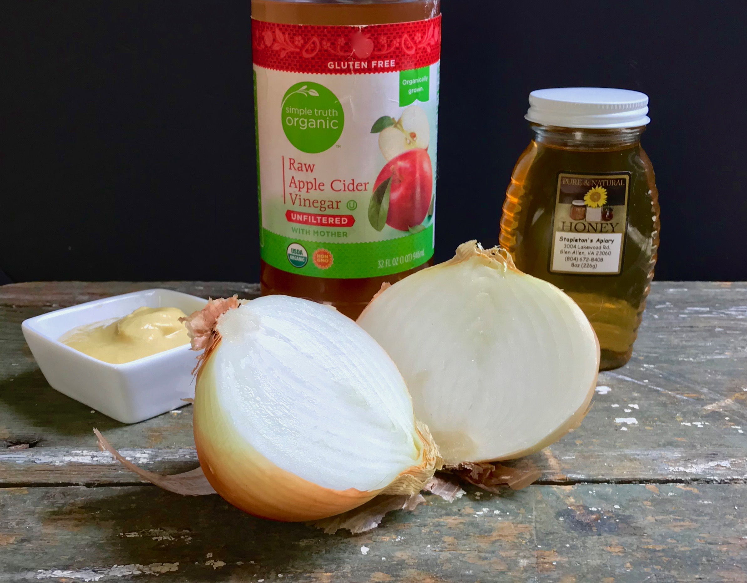 - Place onion, mustard, honey, vinegar and seasonings in the beaker attachment of your immersion blender, or in the bowl of a mini chopper or in a standard blender.