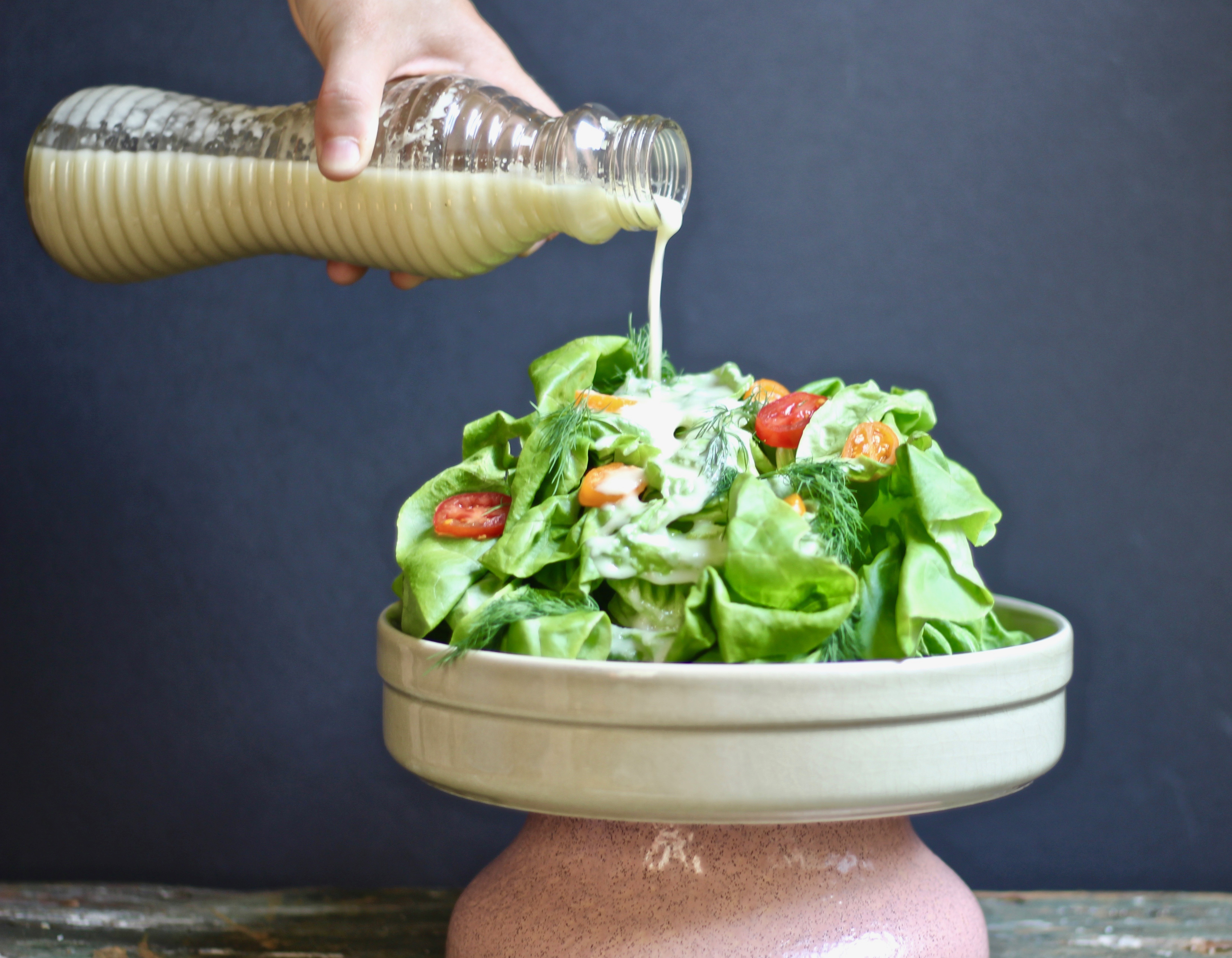 A bit of honey enhances the natural vibe of Vidalias and you can either omit or substitute maple syrup, agave or coconut sugar. Dijon mustard helps thicken and give a proper emulsification. I use pure organic apple cider vinegar, but feel free to use red or white wine vinegar. Balsamic would overpower the onion, so use that for your caprese salad. The only vinegar I would not recommend is distilled white vinegar. This liquid is made in a laboratory and is best for cleaning house. Seriously. Your best friend in the creation of this recipe will be the stick, or immersion, blender; a mini chop or strong stand blender will also accomplish a creamy result.